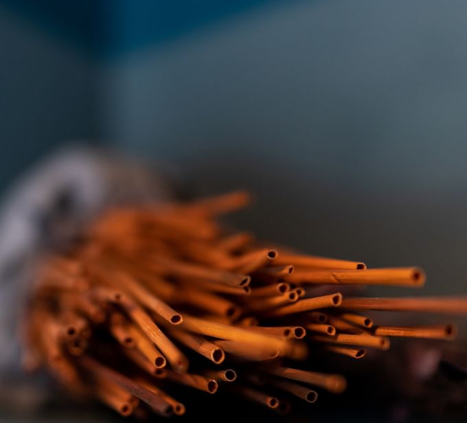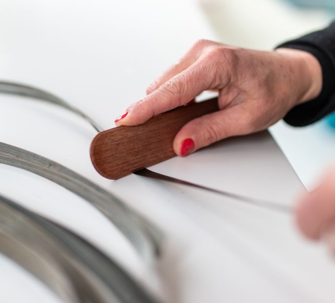Ein weiterer innovativ genutzter, nachhaltiger Werkstoff in unserer Kollektion ist Stroh – ein Naturmaterial mit überraschender Wirkung. Wir setzen es für ausgewählte Modelle der Bell-Table-Serie von Sebastian Herkner ein, darunter der Bell Side Table und Bell Coffee Table. Die Varianten mit aufwendiger Strohmarketerie-Tischplatte ergänzen die erfolgreiche Serie um eine neue, handwerklich besonders anspruchsvolle Komponente. In sorgfältiger Präzisionsarbeit werden feine Strohstreifen radial auf die Tischplatte aufgebracht, sodass sie sich wie Sonnenstrahlen über die Oberfläche ausbreiten. Unterschiedliche Schattierungen des Strohs erzeugen ein lebendiges, fast dreidimensionales Muster. Der warme Charakter des Naturmaterials bildet einen spannenden Kontrast zum gläsernen Fuß und erzeugt reizvolle Lichtreflexionen, die das ikonische Erscheinungsbild des Tischs zusätzlich unterstreichen. Die Strohplatten stammen aus einer der ältesten Strohmanufakturen der Welt. Nur noch wenige Menschen beherrschen diese traditionsreiche Technik – Schätzungen zufolge sind es weniger als zehn. Mit der Zusammenarbeit fördern wir nicht nur ein einzigartiges Handwerk, sondern leisten auch einen aktiven Beitrag zum Erhalt regionaler Produktionskultur und nachhaltiger Gestaltung.