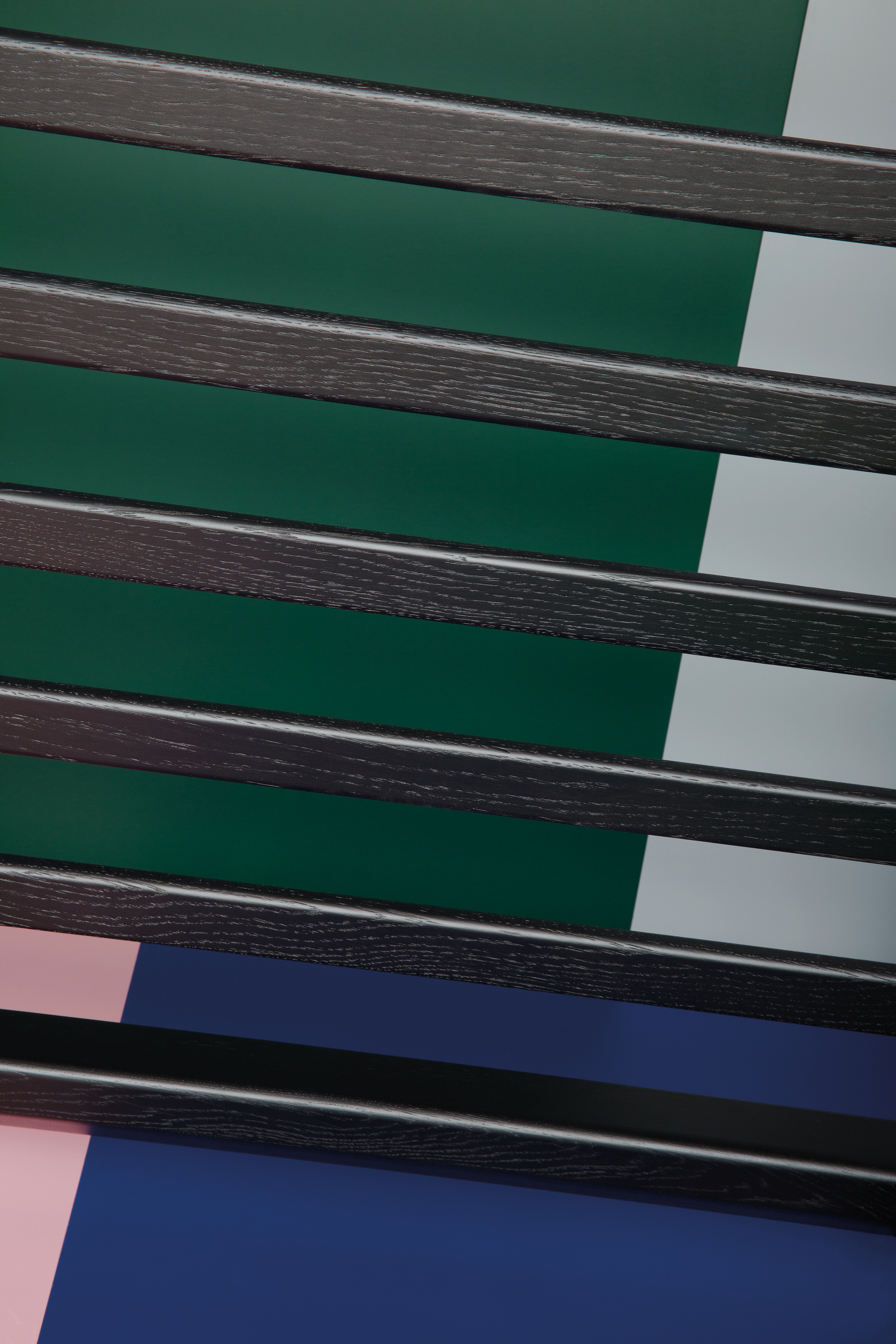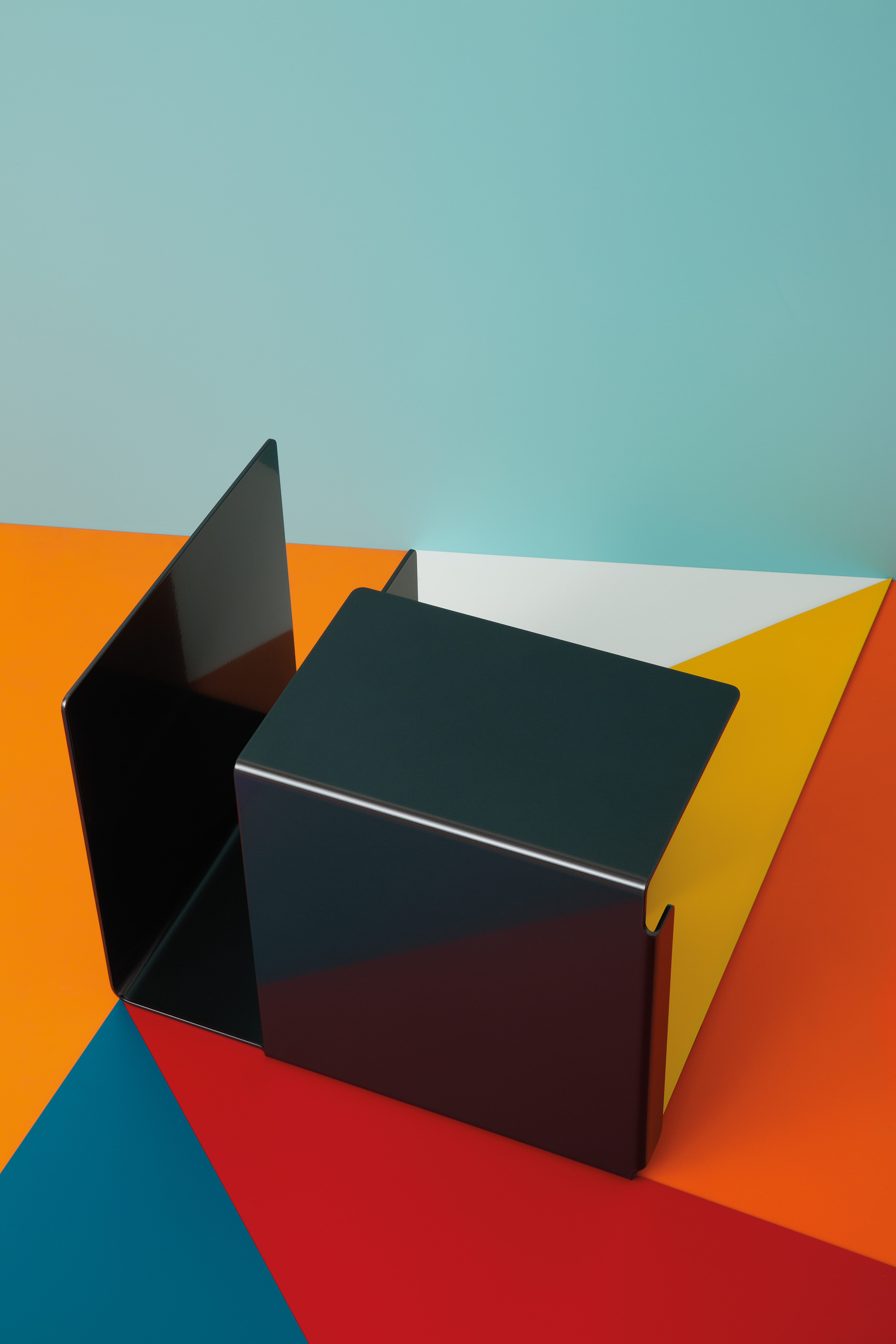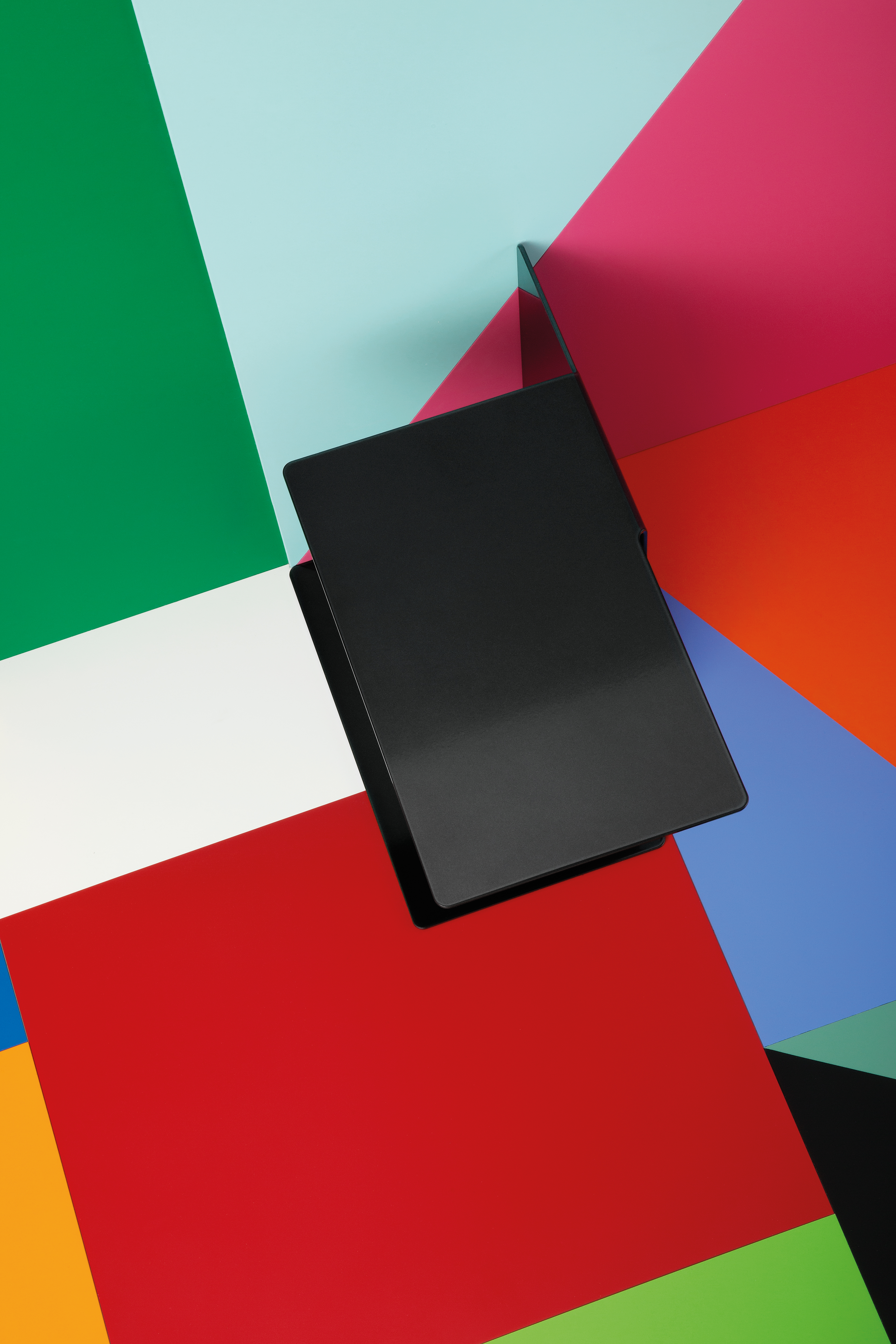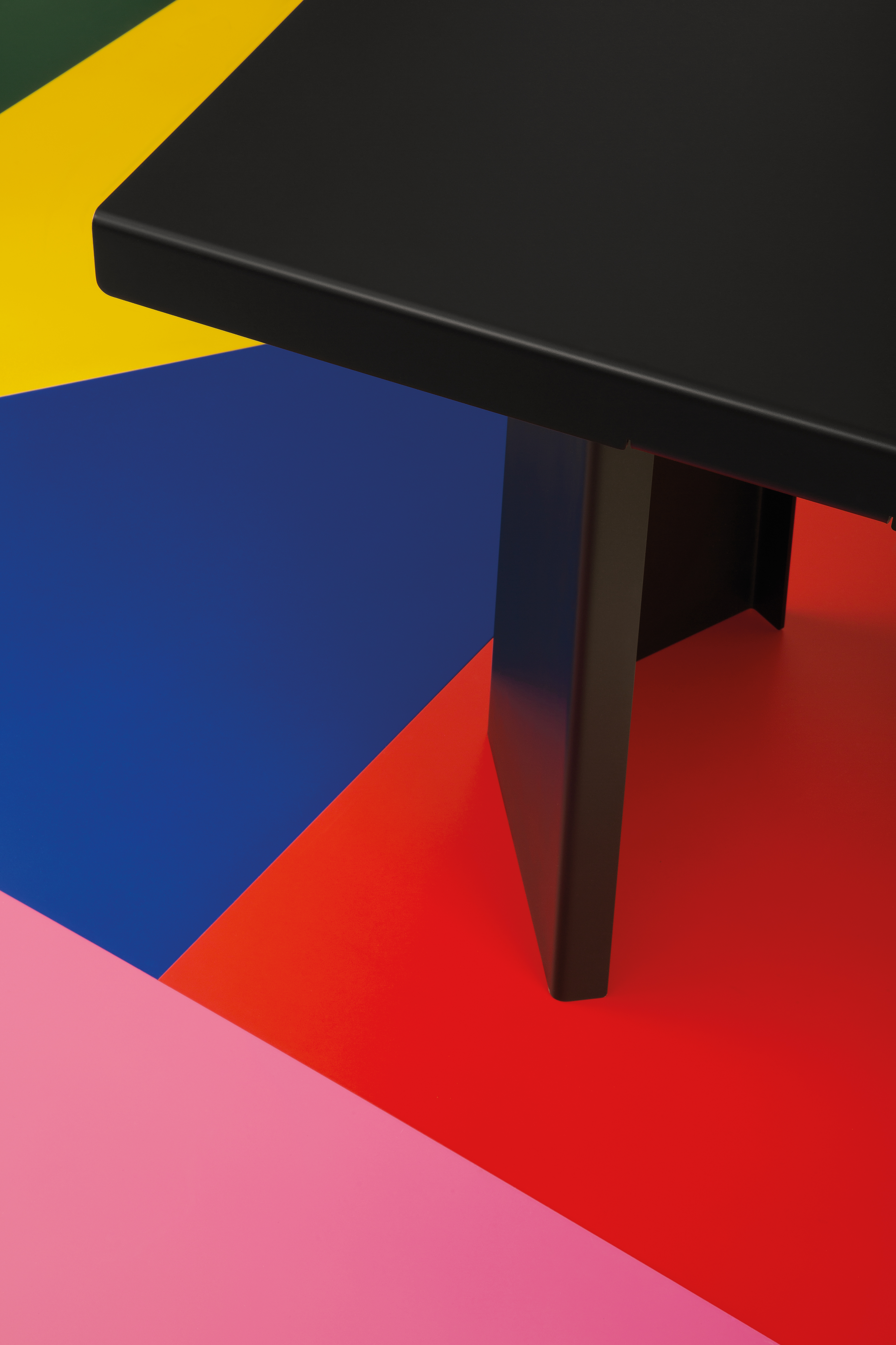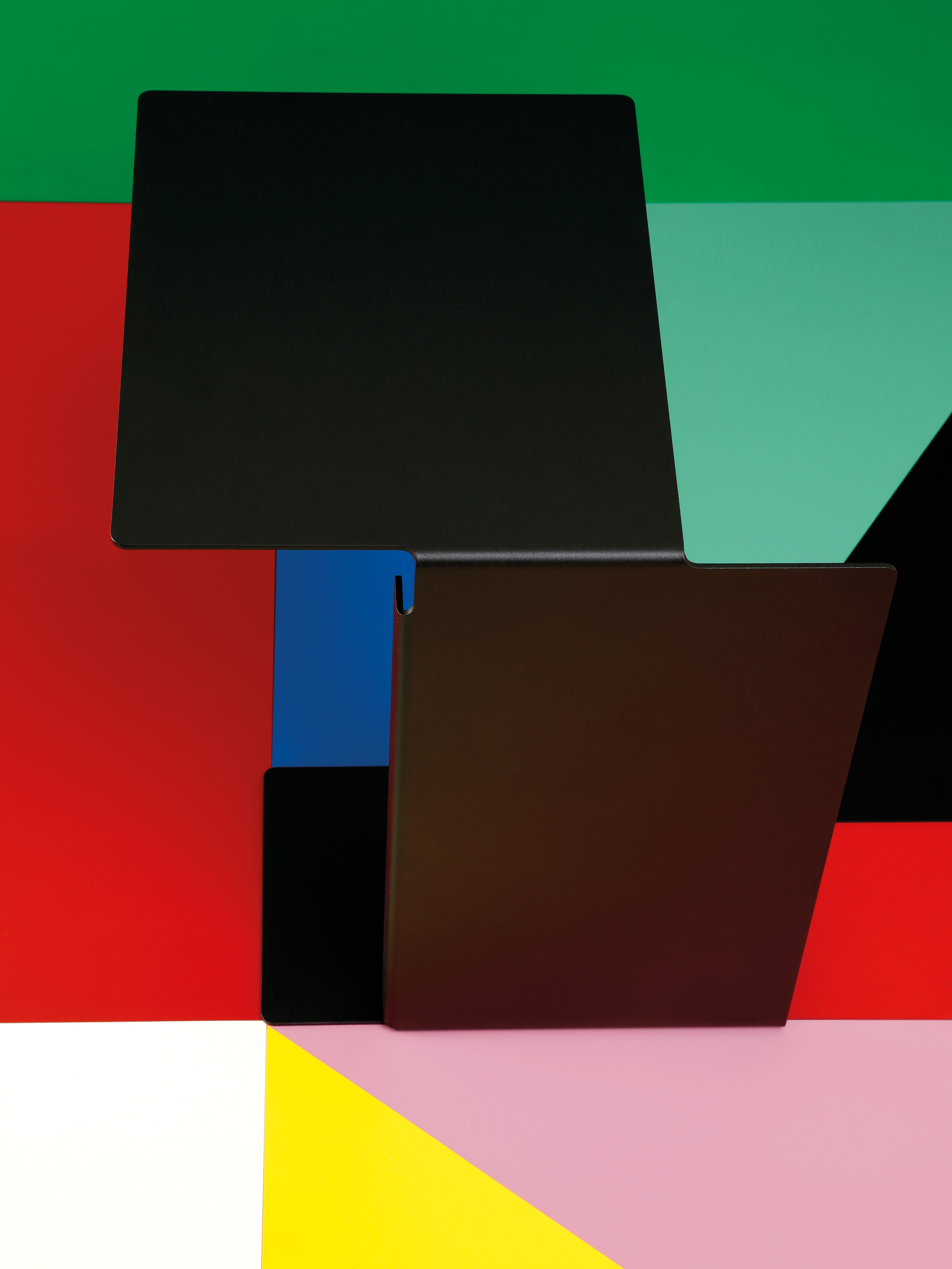 Wie bei ihren eigenen Arbeiten auch, konzentriert sich Shirana Shahbazi bei den Fotos der Black Edition auf die Aufhebung der Realität, klar definierte Formen und Dimensionen. Ihre Aufnahmen vor schwarzem Hintergrund zeigen die klare Linearität der Entwürfe von Grcic rein durch Lichteinfall und Perspektivenwechsel – und lassen so ein spannendes Wechselspiel mit dem monochromen Hintergrund entstehen. Im Kontrast zu den farbigen Elementen wiederum abstrahiert Shahbazi die Dreidimensionalität der Möbel zu einer leuchtenden Komposition, welche die einzelnen Formen von Dreiecken, Quadraten und Winkeln in angrenzende Flächen zerlegt.