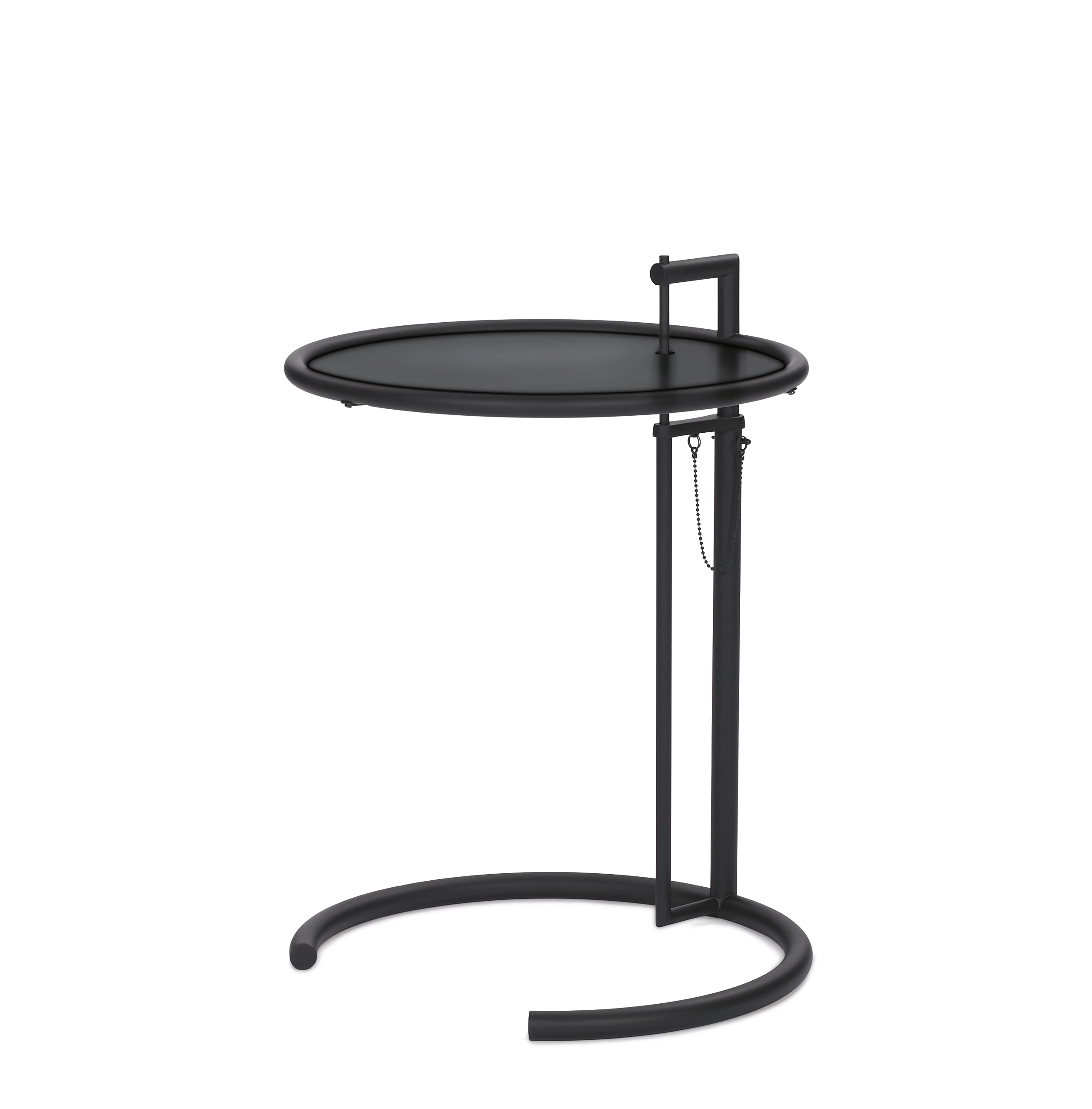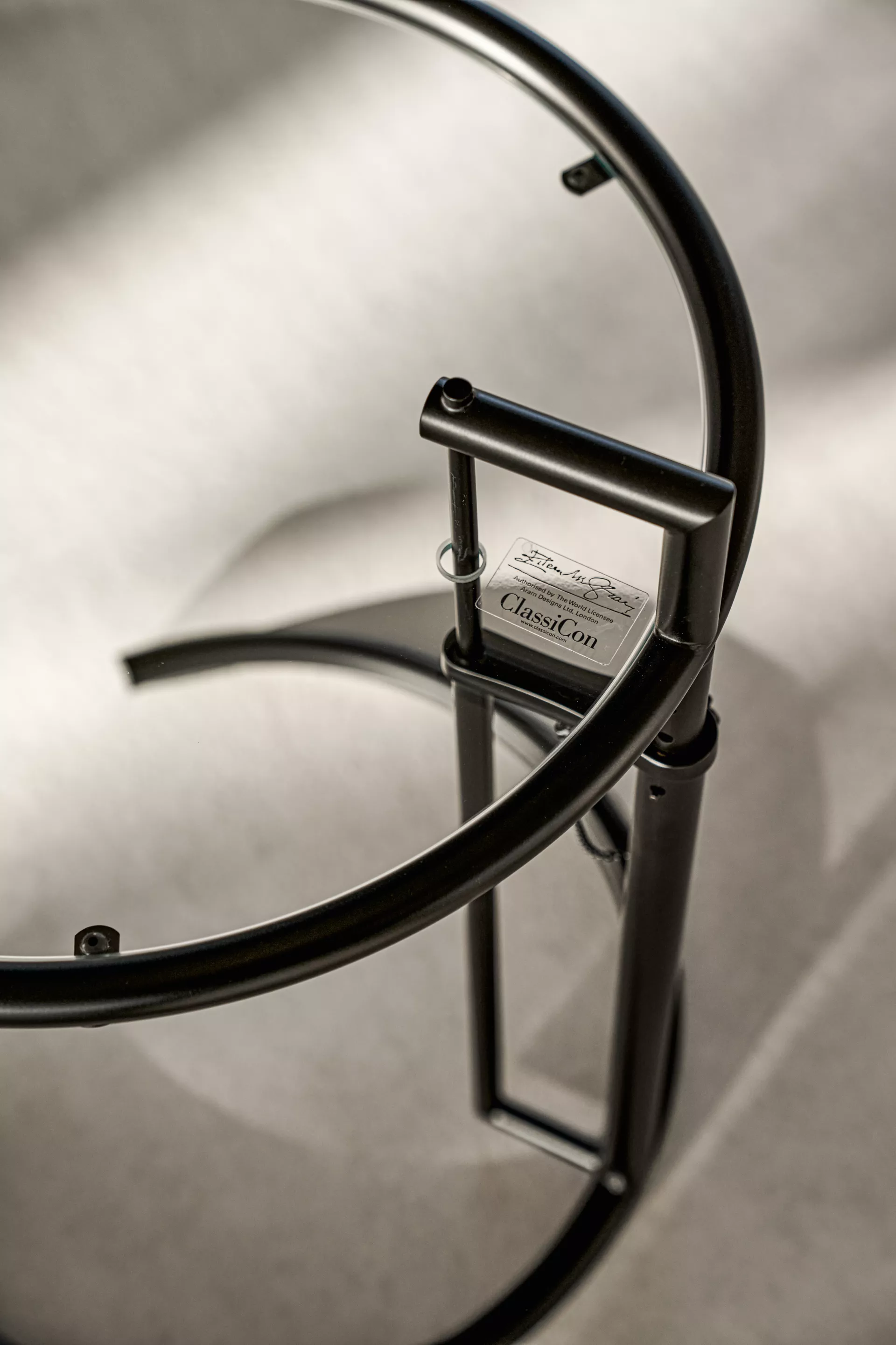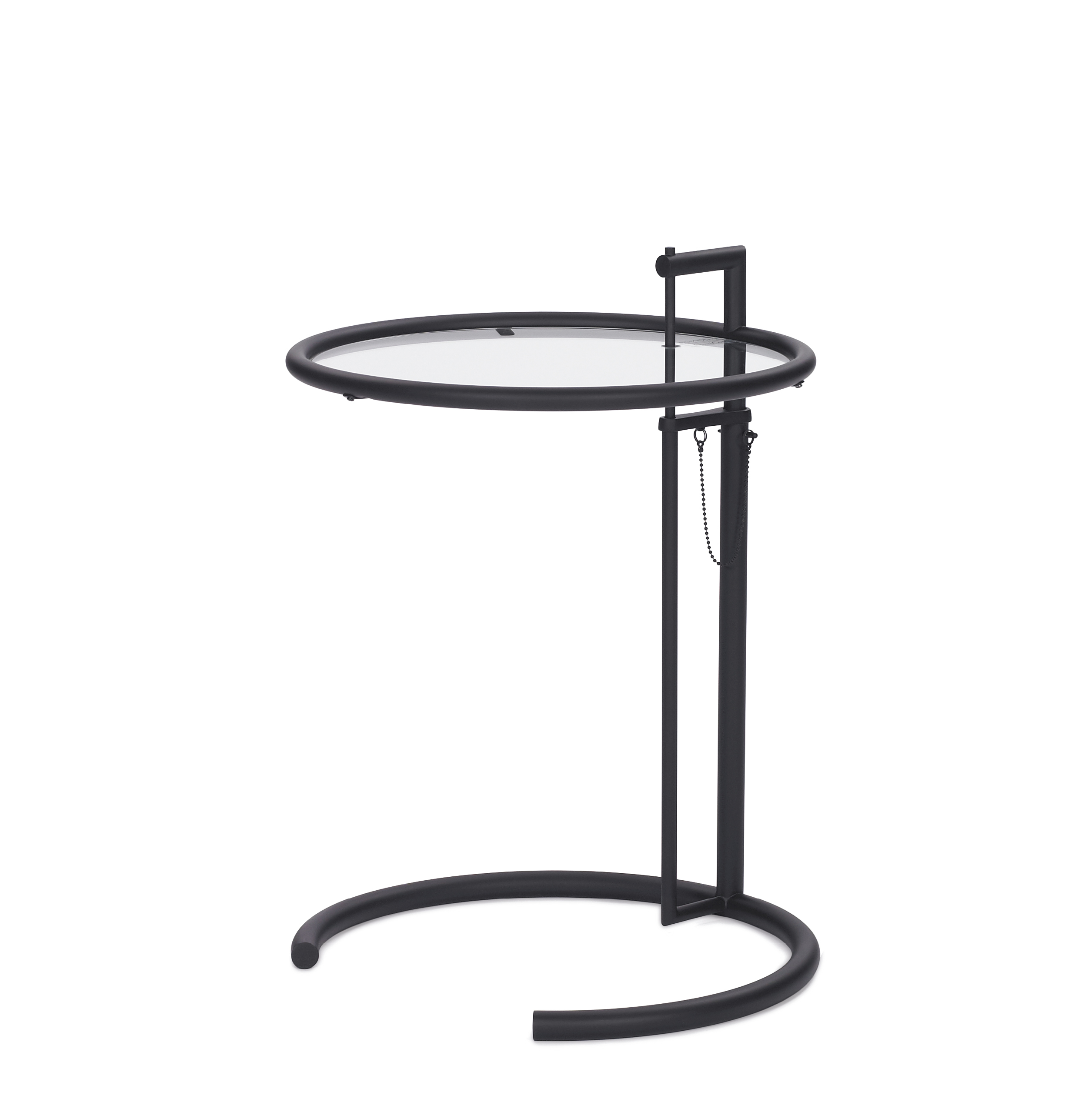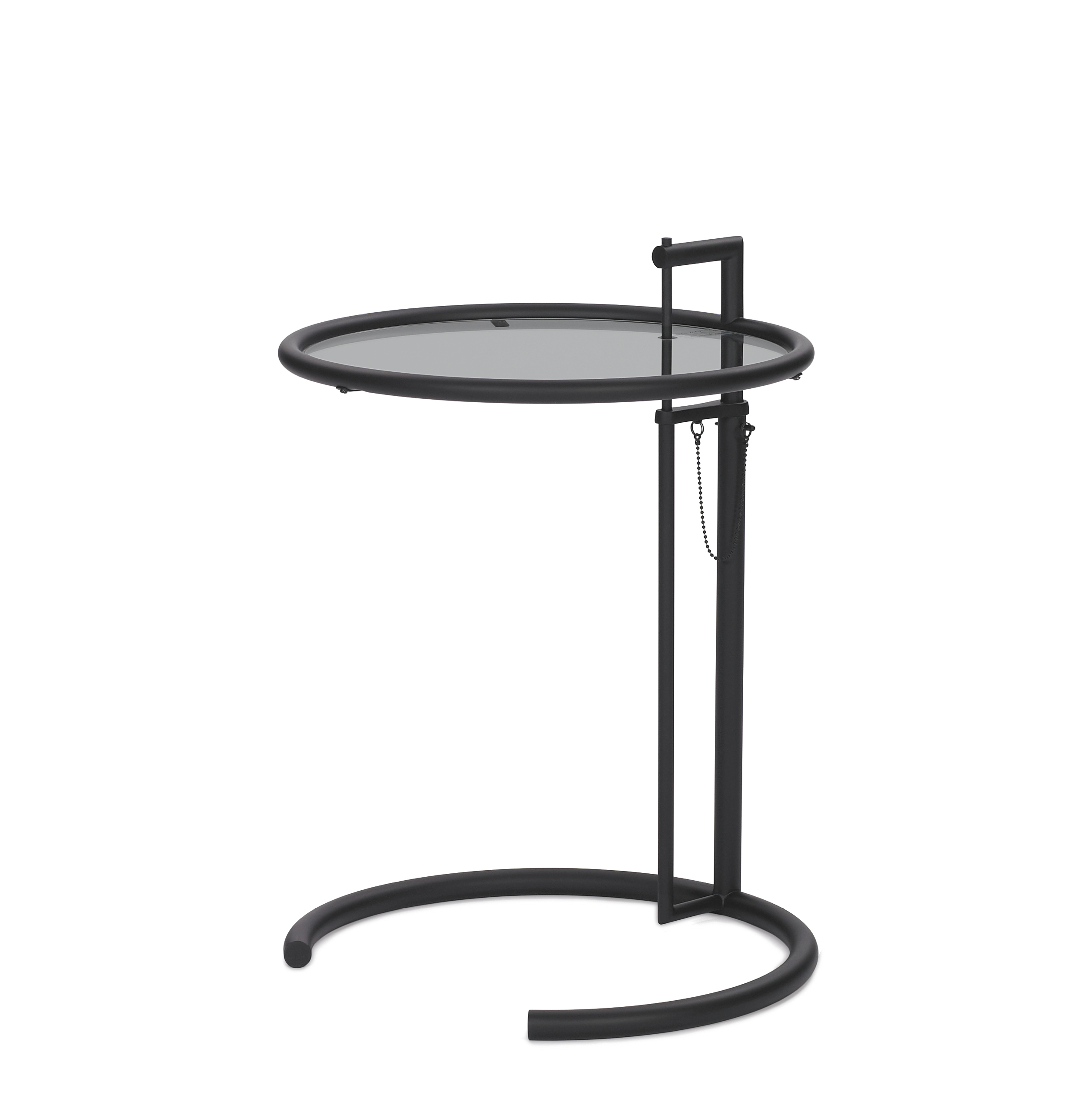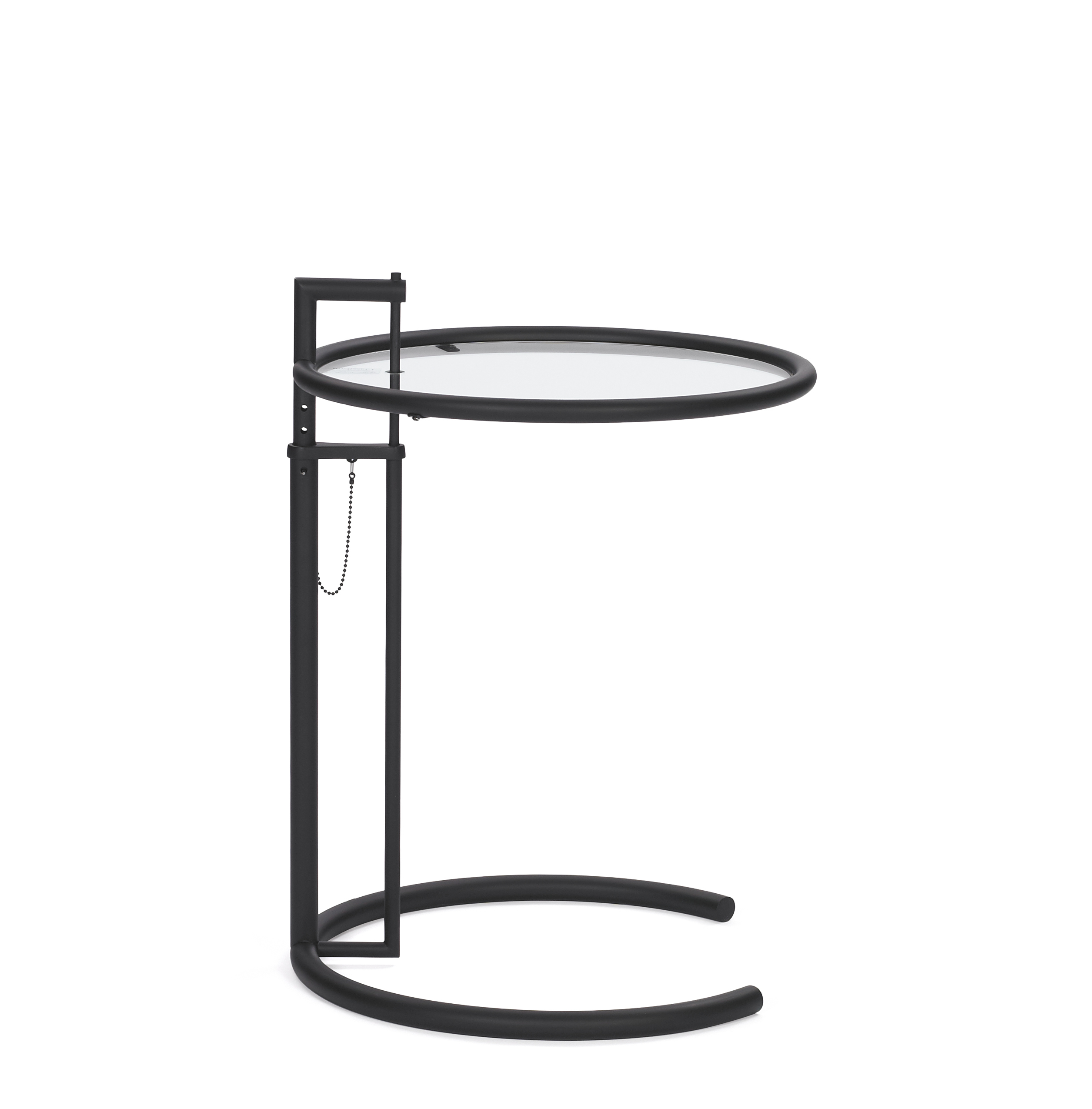 Unter den Klassikern ist dies wohl der Klassiker. Seine genial proportionierte, unverwechselbare Form hat den höhenverstellbaren Tisch zu einer der populärsten Design-Ikonen des 20. Jahrhunderts werden lassen. Er ist nach dem Haus E 1027 ‚Maison en bord de mer‘ benannt, das Eileen Gray für sich und ihren Partner Jean Badovici baute. In diesem Codenamen steht das E für Eileen, 10 für Jean (J ist der 10. Buchstabe des Alphabets), 2 für B(adovici) und 7 für G(ray). In den 1920er Jahren experimentierte Eileen Gray mit Varianten zu ihrem Entwurf des Adjustable Table E1027. So wie sie die Optik des Tisches mit einer schwarzen Metallplatte als Alternative zur Kristallglasplatte verwandelte, wählte sie auch Schwarz als Farbe für das Gestell. Das matte Schwarz der Beschichtung hebt die Linienführung und Form besonders klar hervor – eine Ausführung, die sie als sehr elegant empfand. In den 1970er Jahren entwickelte Eileen Gray zusammen mit Zeev Aram ihren Adjustable Table E 1027 zur Produktionsreife und entschied sich mit Aram zunächst für die verchromte Ausführung, mit dem Verständnis, den Tisch mit schwarzem Gestell zu einem späteren Zeitpunkt einzuführen.