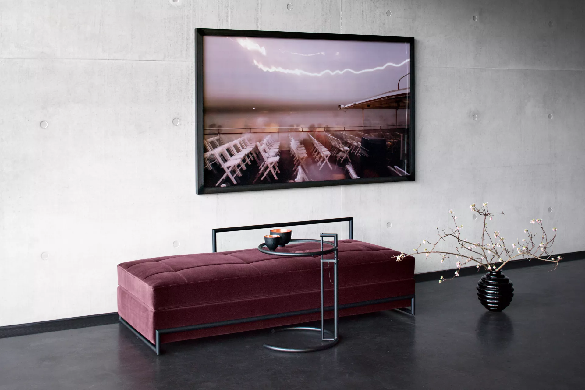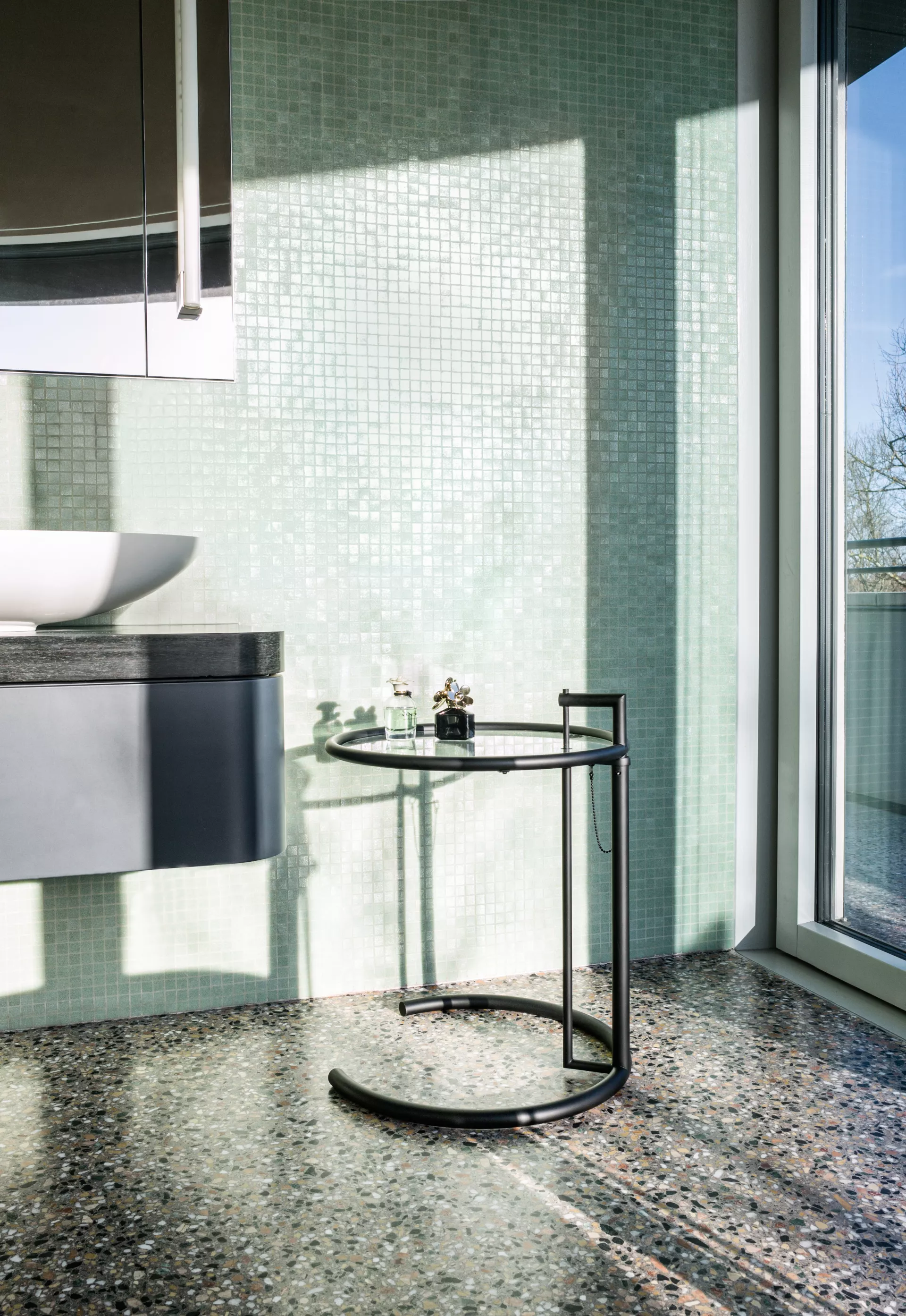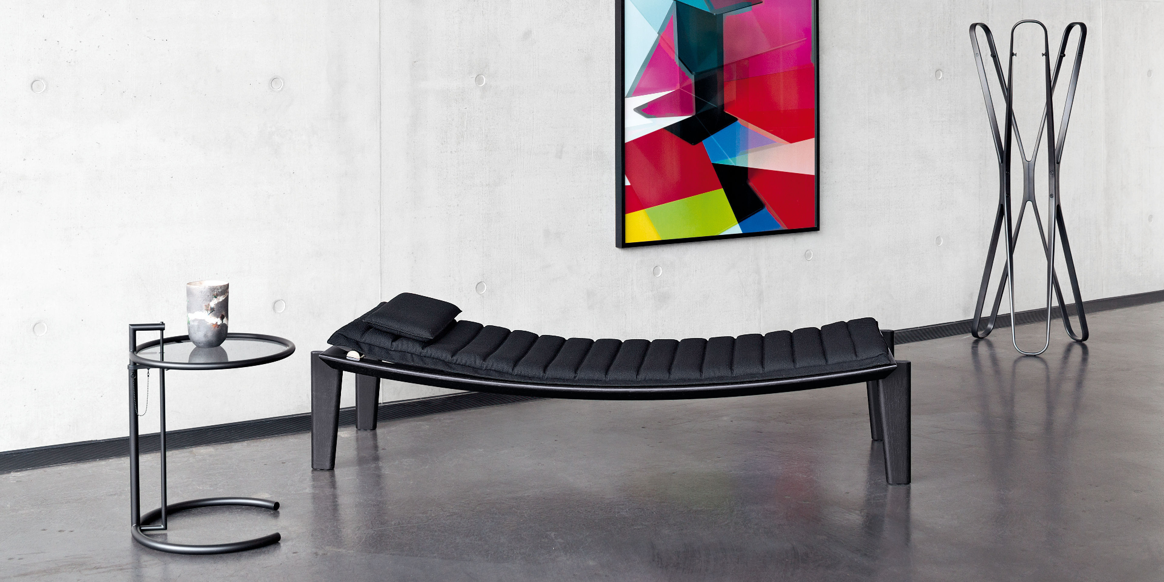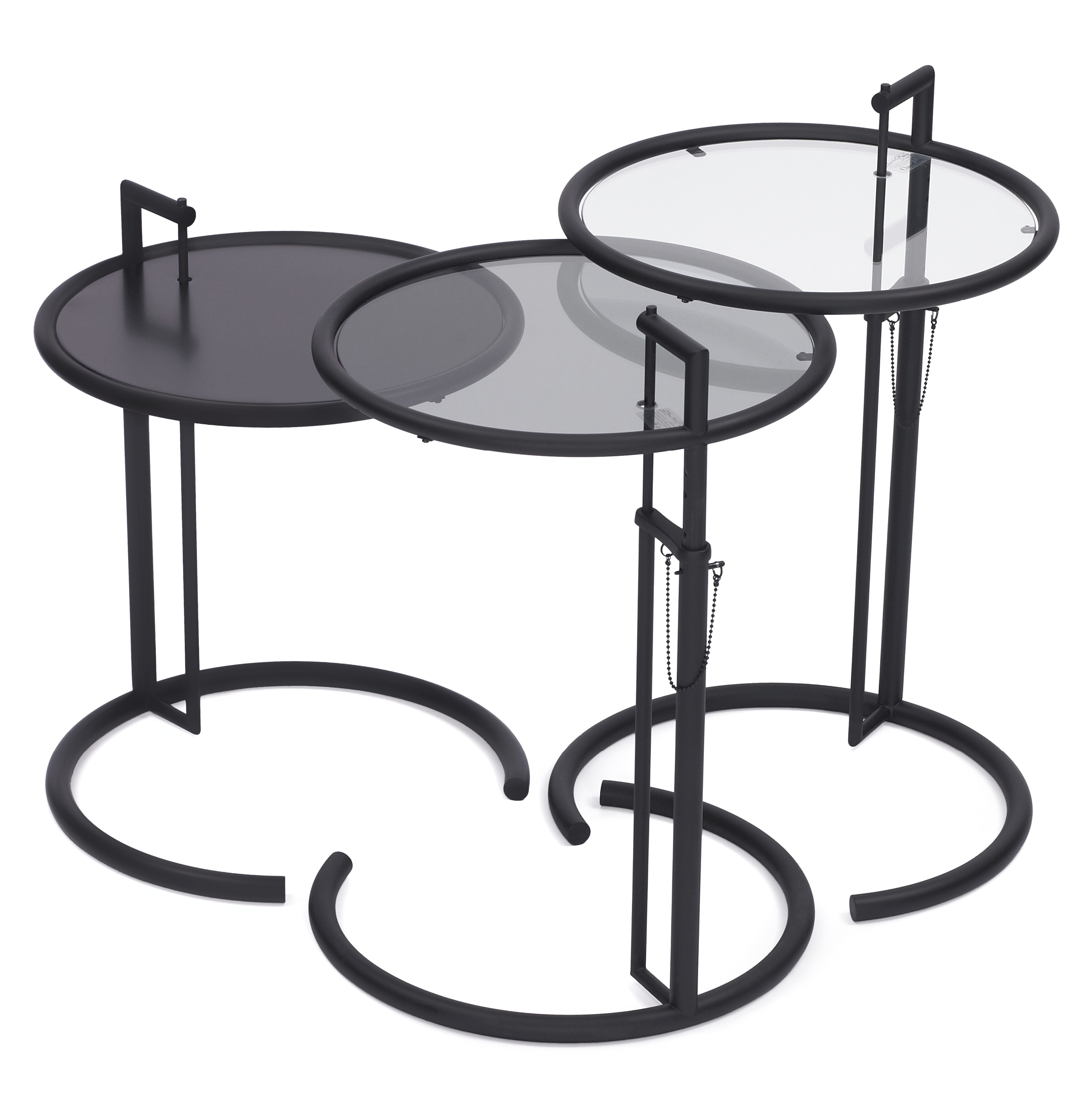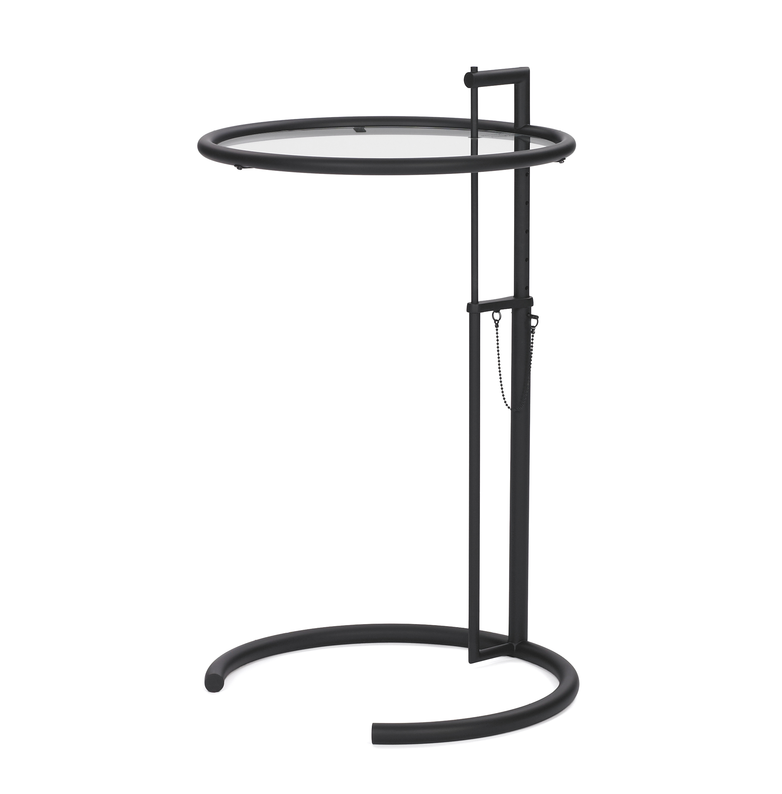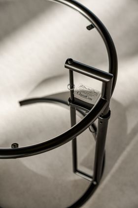 Unter den Klassikern ist dies wohl der Klassiker. Seine genial proportionierte, unverwechselbare Form hat den höhenverstellbaren Tisch zu einer der populärsten Design-Ikonen des 20. Jahrhunderts werden lassen. Er ist nach dem Haus E 1027 ‚Maison en bord de mer‘ benannt, das Eileen Gray für sich und ihren Partner Jean Badovici baute. In diesem Codenamen steht das E für Eileen, 10 für Jean (J ist der 10. Buchstabe des Alphabets), 2 für B(adovici) und 7 für G(ray). In den 1920er Jahren experimentierte Eileen Gray mit Varianten zu ihrem Entwurf des Adjustable Table E1027. So wie sie die Optik des Tisches mit einer schwarzen Metallplatte als Alternative zur Kristallglasplatte verwandelte, wählte sie auch Schwarz als Farbe für das Gestell. Das matte Schwarz der Beschichtung hebt die Linienführung und Form besonders klar hervor – eine Ausführung, die sie als sehr elegant empfand. In den 1970er Jahren entwickelte Eileen Gray zusammen mit Zeev Aram ihren Adjustable Table E 1027 zur Produktionsreife und entschied sich mit Aram zunächst für die verchromte Ausführung, mit dem Verständnis, den Tisch mit schwarzem Gestell zu einem späteren Zeitpunkt einzuführen.