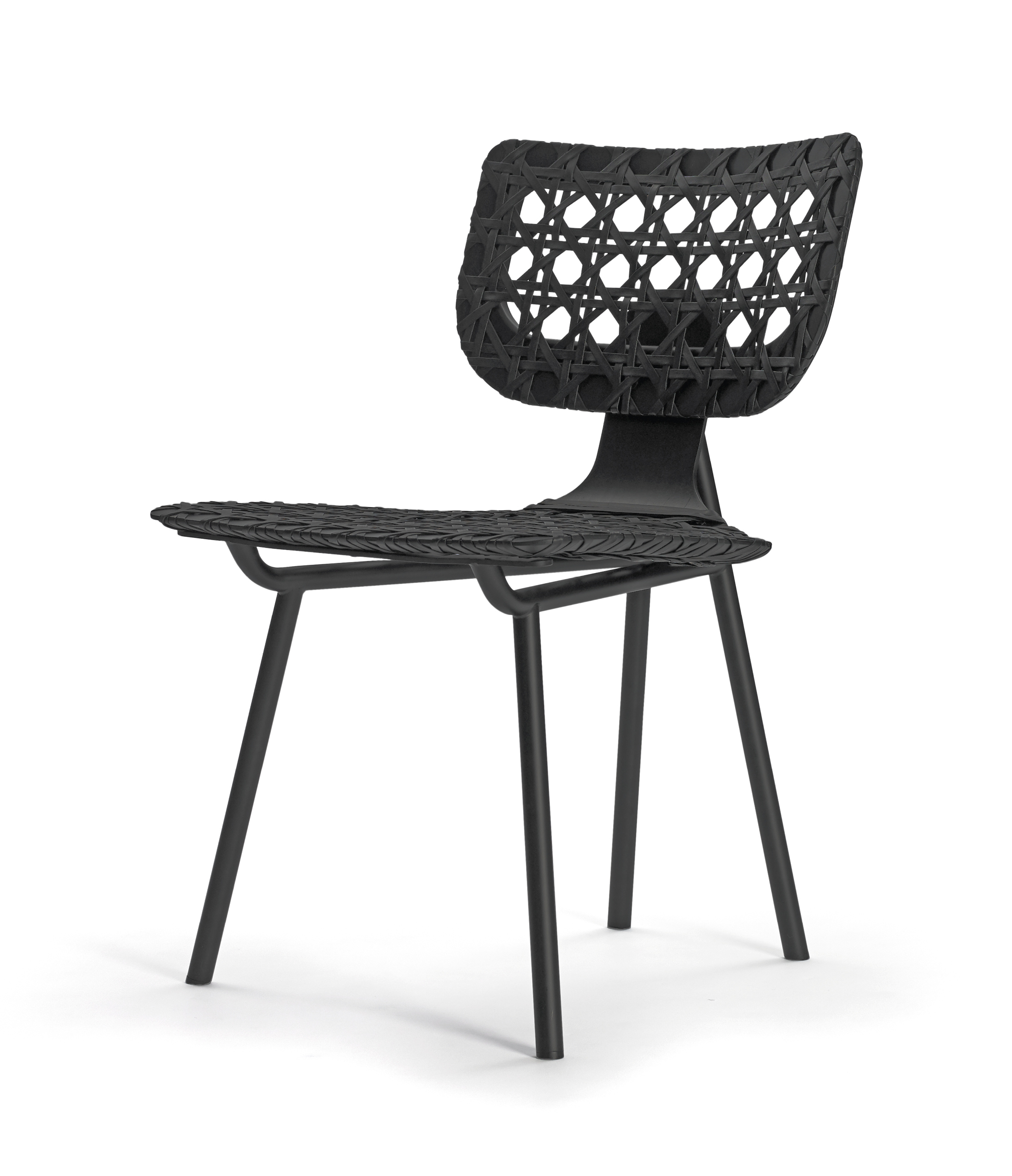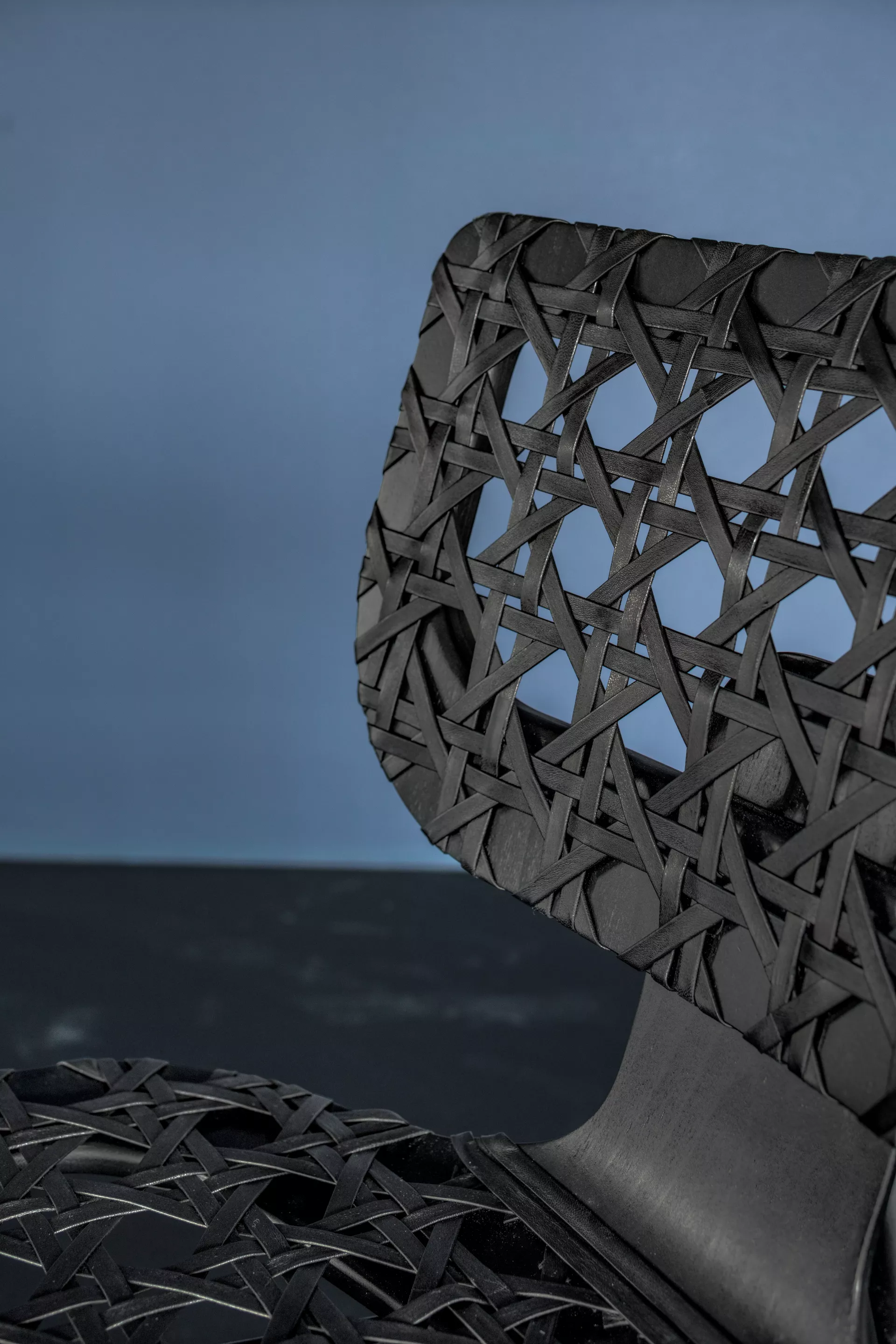 Aërias überrascht mit formaler Prägnanz, Leichtigkeit und neuartigem Flechtwerk: Das vertraute Muster des Wiener Geflechts wird mit einem veränderten Maßstab und Leder als Flechtmaterial neu interpretiert. Und so wie sich die Anmutung einer Schrift mit ihrer Größe verändert, gewinnt auch das traditionelle Flechtmuster beim Aërias durch die vielfache Vergrößerung an Charakter. Der große Sitzkomfort ergibt sich durch das Spannen von Lederbändern über einen Holzrahmen. Vergleichbar mit einer Trommelbespannung entstehen gefederte Minimalflächen, die die Bewegungen des Körpers aufnehmen und das Sitzen und Anlehnen besonders angenehm machen.