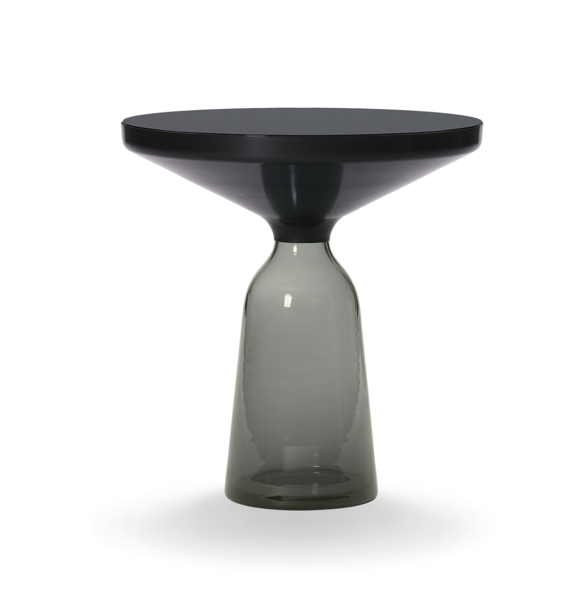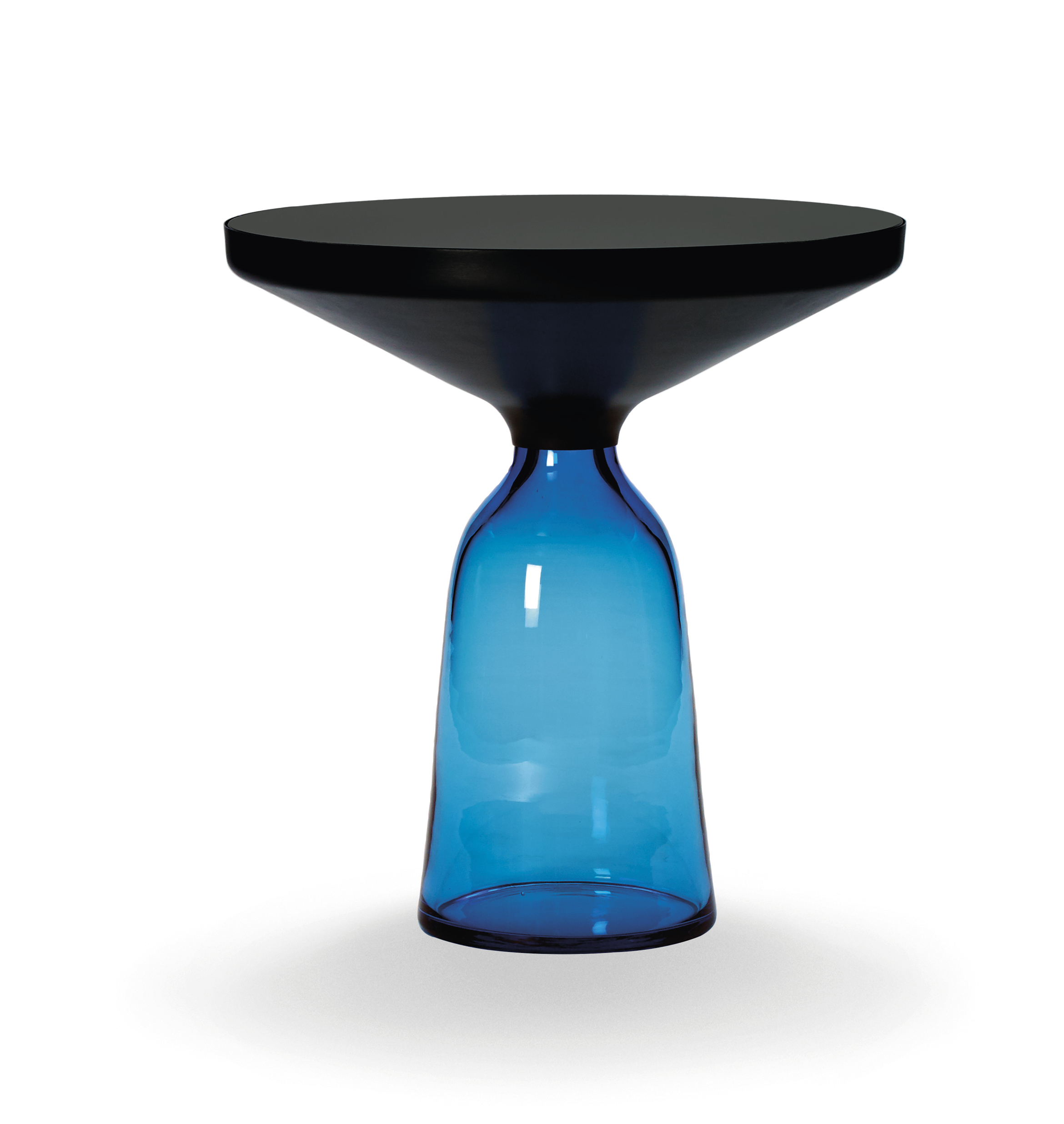 Der Bell Table von Sebastian Herkner stellt den gewohnten Umgang mit Materialien auf den Kopf und überrascht unsere Wahrnehmung: Hier wird der Tischfuß zur prägnanten, farbig-transparenten Glasform im Raum, auf dem ein Metallkörper aufliegt. Das Glas verhilft dem an sich schweren Metall zu schwebender Leichtigkeit. Der traditionell in eine Holzform geblasene Glasfuß und der gedrückte Metallkörper treten in einen spannenden Kontrast und bilden doch formal eine harmonische Einheit, die an den eleganten Schwung einer Glocke erinnert.