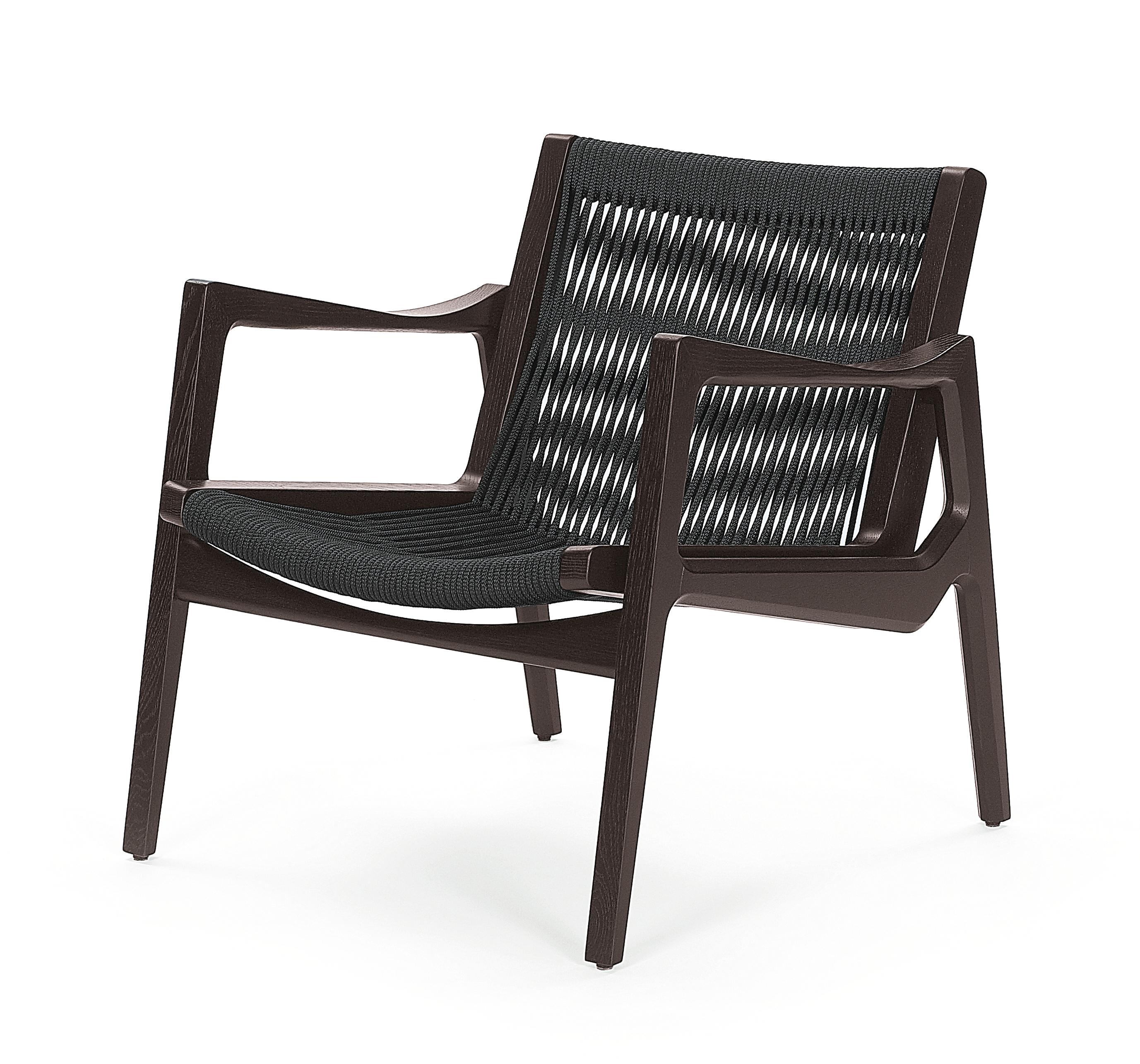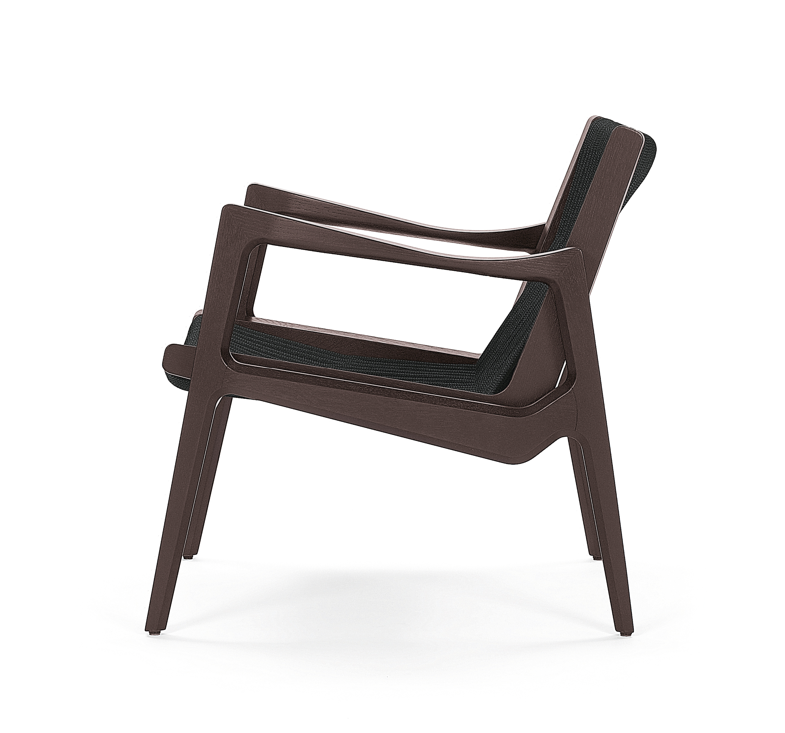 Mit dem Euvira Lounge Chair knüpft Jader Almeida souverän an die Entwürfe der großen brasilianischen Meister des Designs der Sechziger- und Siebzigerjahre an und findet doch gleichzeitig eine eigenständige, zeitgenössische Ausdrucksform. Seine präzise ausformulierten Formverläufe, fein gezeichneten Linien, sowie Materialverdickungen und –verjüngungen lassen ihn solide und gleichzeitig elegant wirken. Die kordelbespannten Flächen sorgen für ein grafisches Linienspiel, das dem Sessel Transparenz verleiht und trotzdem für hohen Komfort sorgt. In dunkel gebeizter Eiche mit schwarzer Kordel verweist der Euvira Lounge Chair am deutlichsten auf die Herkunft seines Entwerfers. In heller Eiche mit hanffarbener Kordelbespannung wirkt er fast wie ein skandinavischer Möbelklassiker. Stoff- oder lederbezogene Polster steigern seinen Ausdruck von Bequemlichkeit.