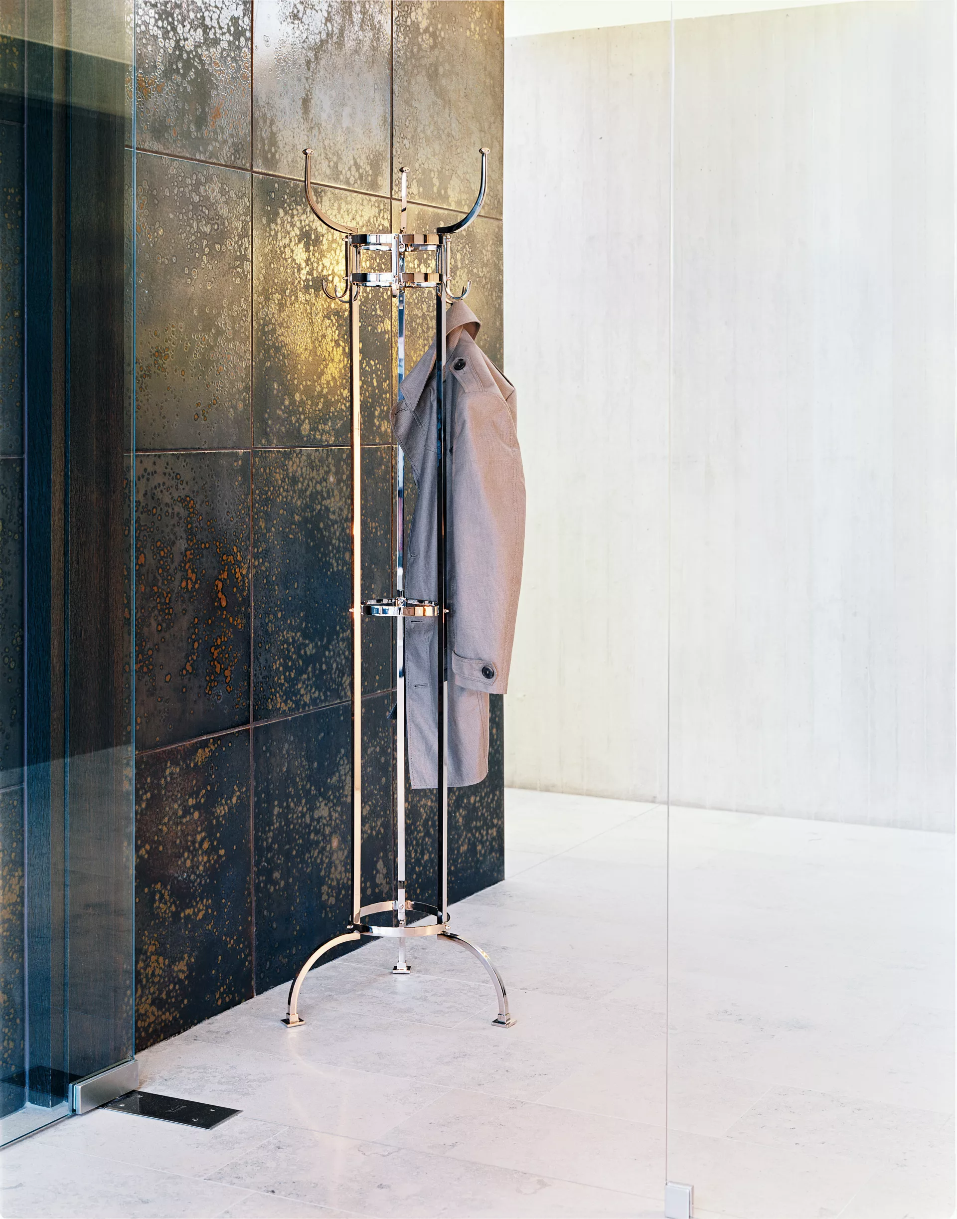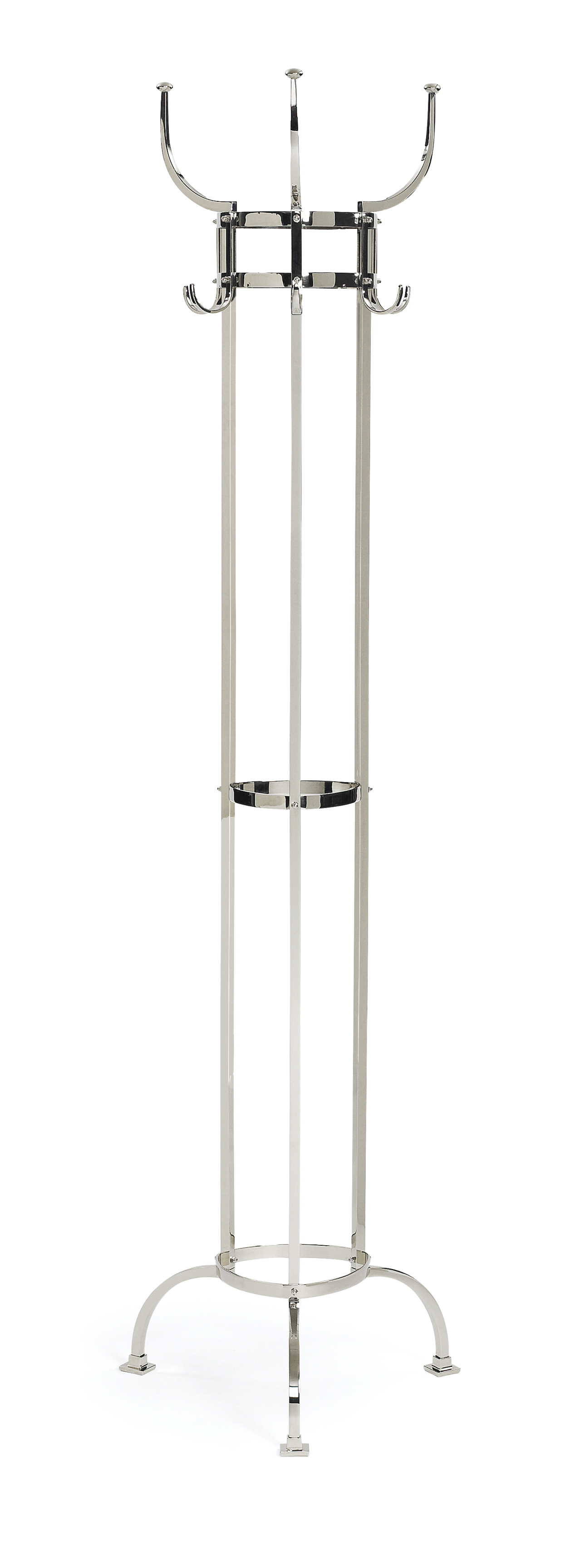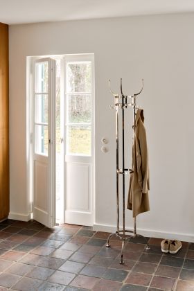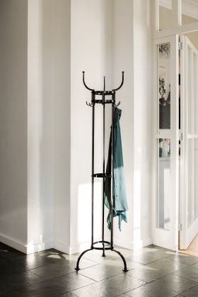 Es ist ein Zeichen höchster Kultur, wenn auch alltägliche Gebrauchsobjekte zum ästhetischen Blickfang werden. Otto Blümels Garderobenständer Nymphenburg ist ein archetypischer Klassiker seiner Gattung, den man sich in einem Pariser Bistro genauso vorstellen kann wie in einer Salzburger Villa. Ein Design-Klassiker, der seine Zeit überdauert, denn der Nymphenburg ist bereits über 110 Jahre alt. Vernickelt, schwarz vernickelt oder neu in Schwarz pulverbeschichtet passt er perfekt in jedes Ambiente.