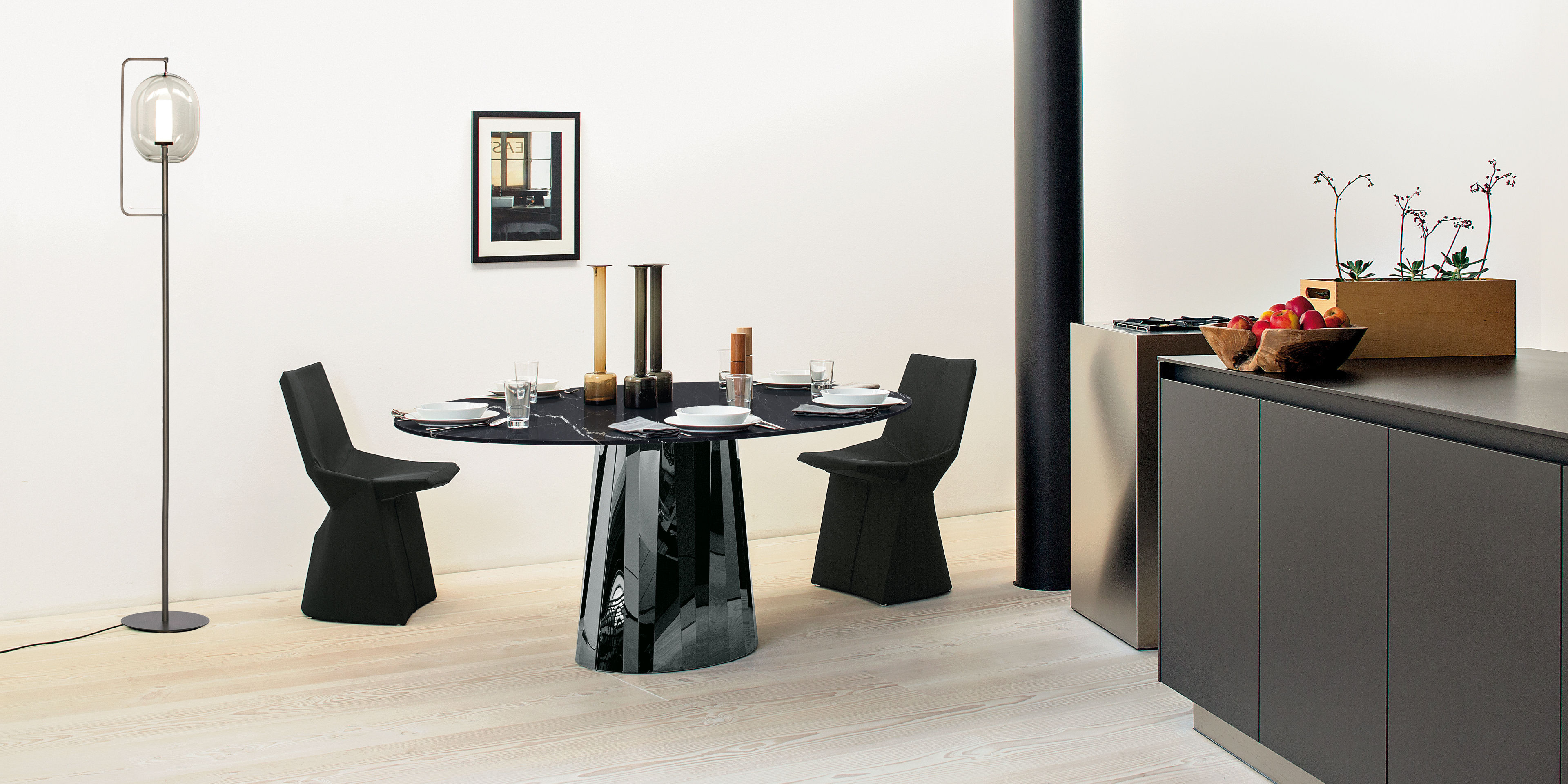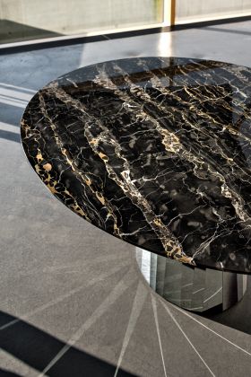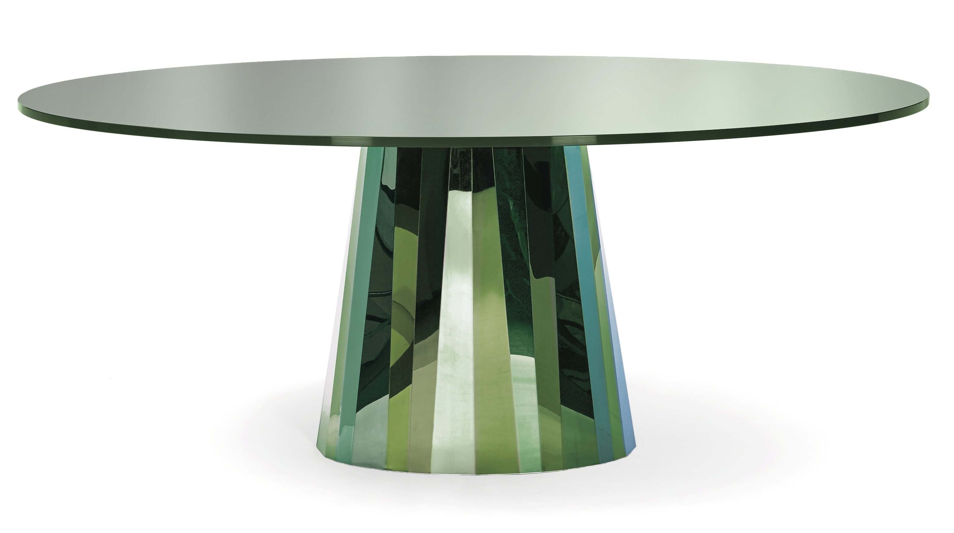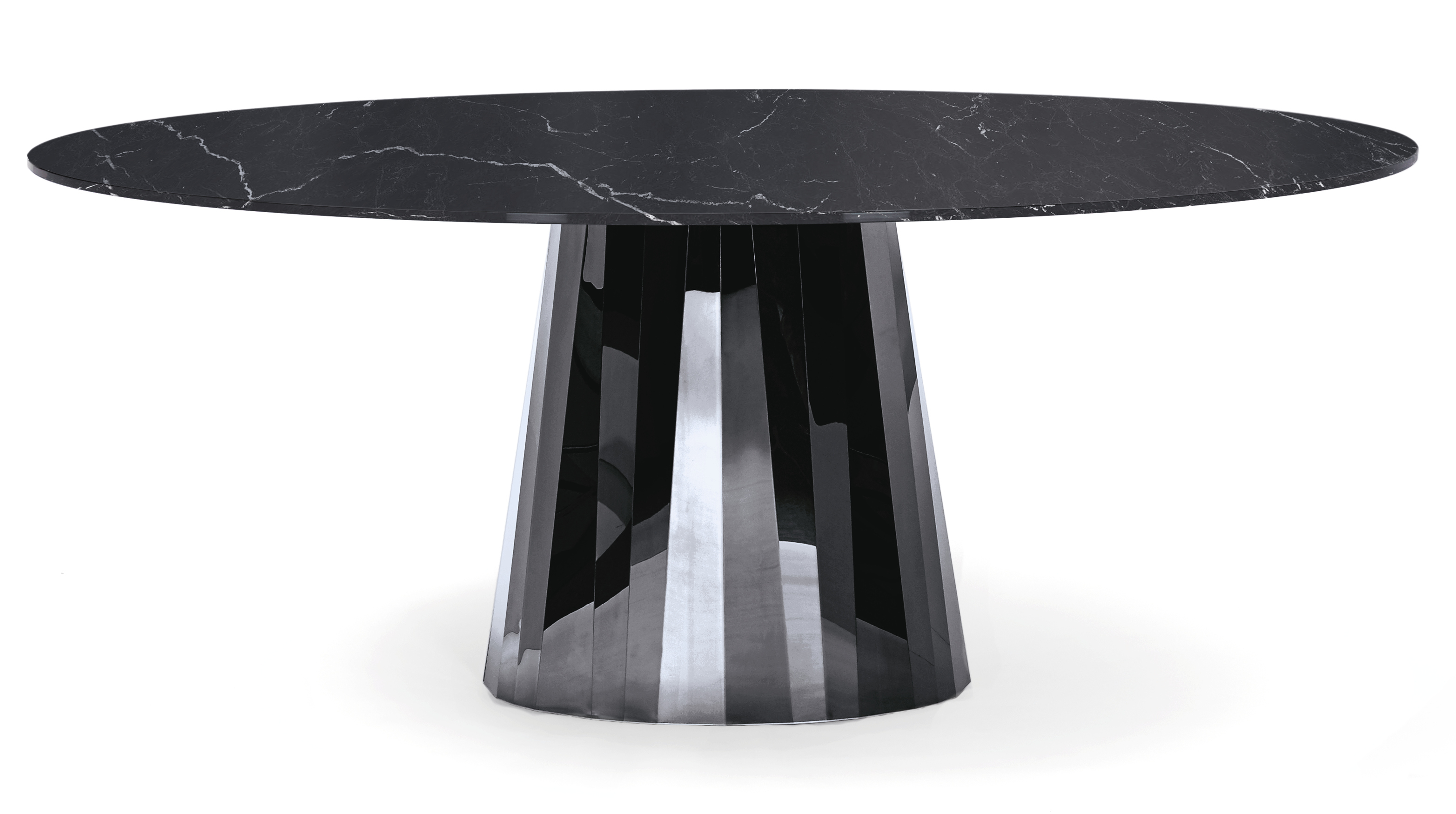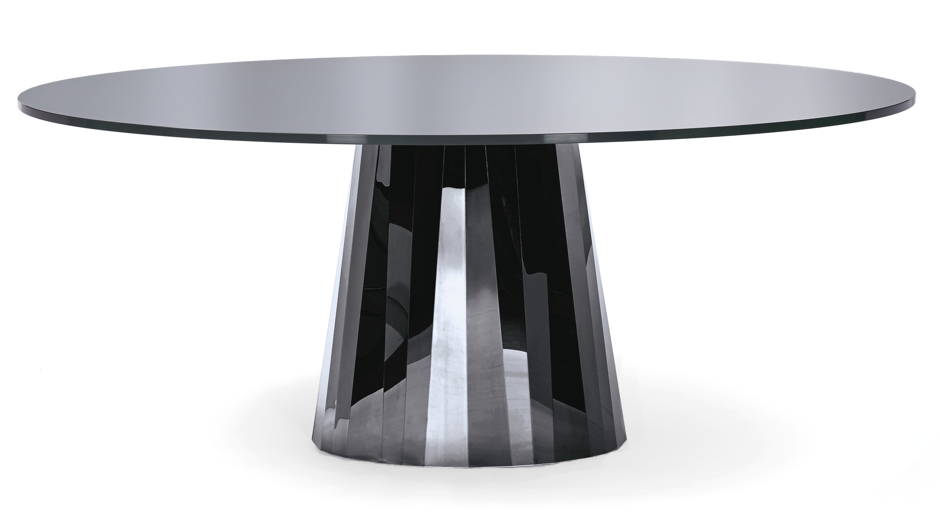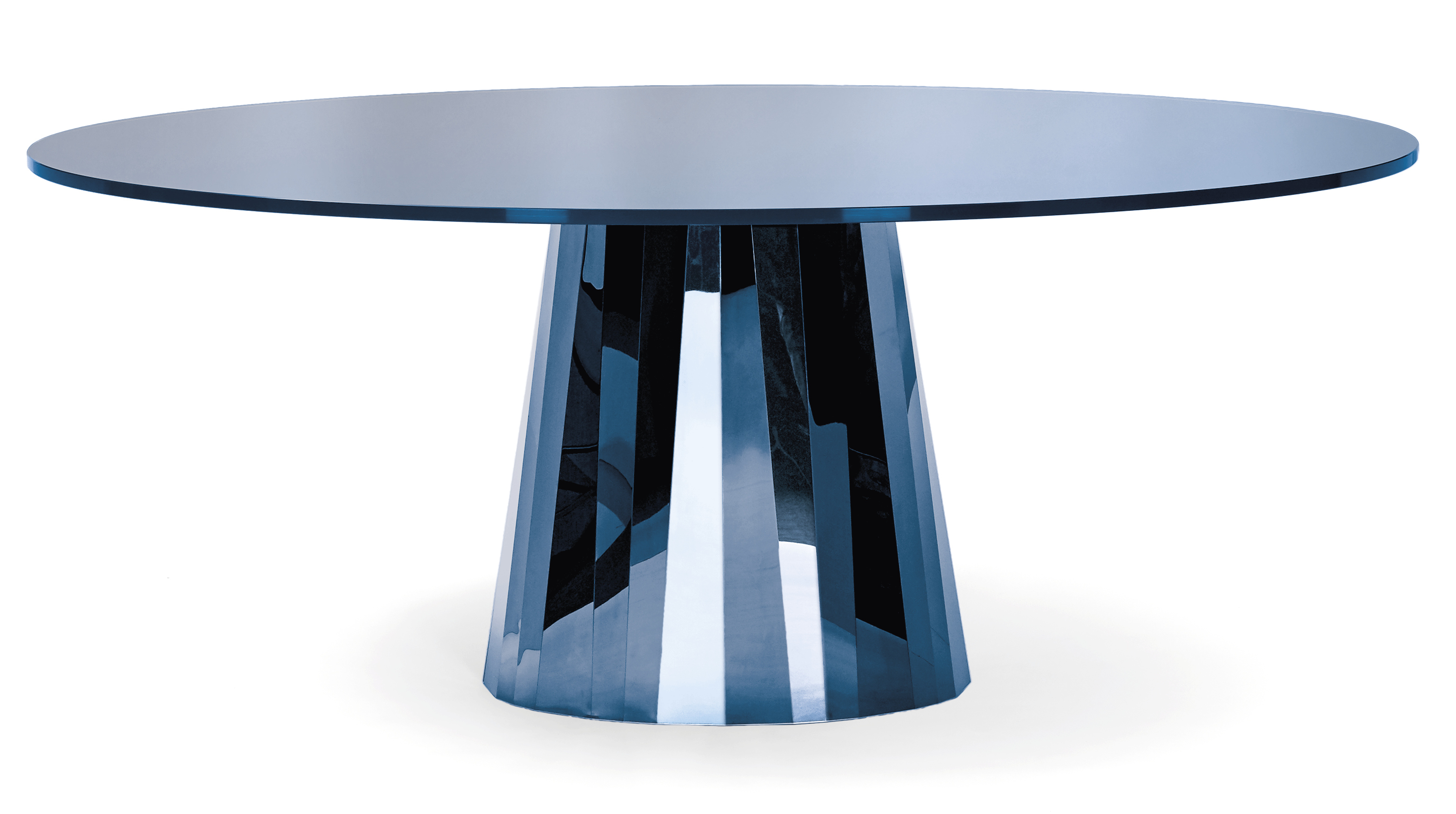 Mit der Tischserie Pli bringt die französische Designerin Victoria Wilmotte Objekte von ungewöhnlicher kristalliner Eleganz und verblüffender Geometrie in den Wohnraum, in das Esszimmer oder Foyerbereiche. Die Knicke und Faltungen, von denen Pli seinen Namen bezieht, lassen den Edelstahlfuß fast wie einen überdimensional geschliffenen Edelstein erscheinen. Die ovalen Formen von Grundfläche und Tischplatte des Tisches stehen in reizvollem Kontrast zu den Facetten des Fußes, die für ein faszinierendes Spiel mit Lichtbrechungen und Farbreflexen im Raum sorgen. Der Pli Table kann als repräsentativer Esstisch für bis zu acht Personen dienen. Im Entrée oder Foyer, in Galerien und Läden kann er aber auch als spektakulärer Blickfang eingesetzt werden.