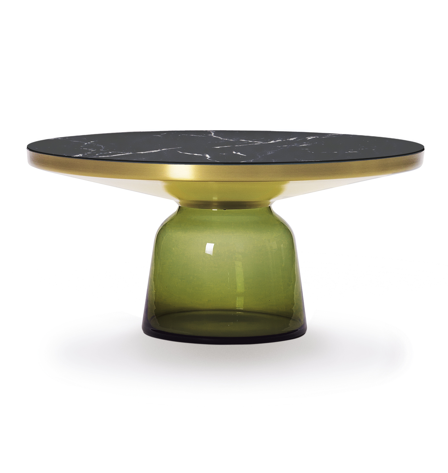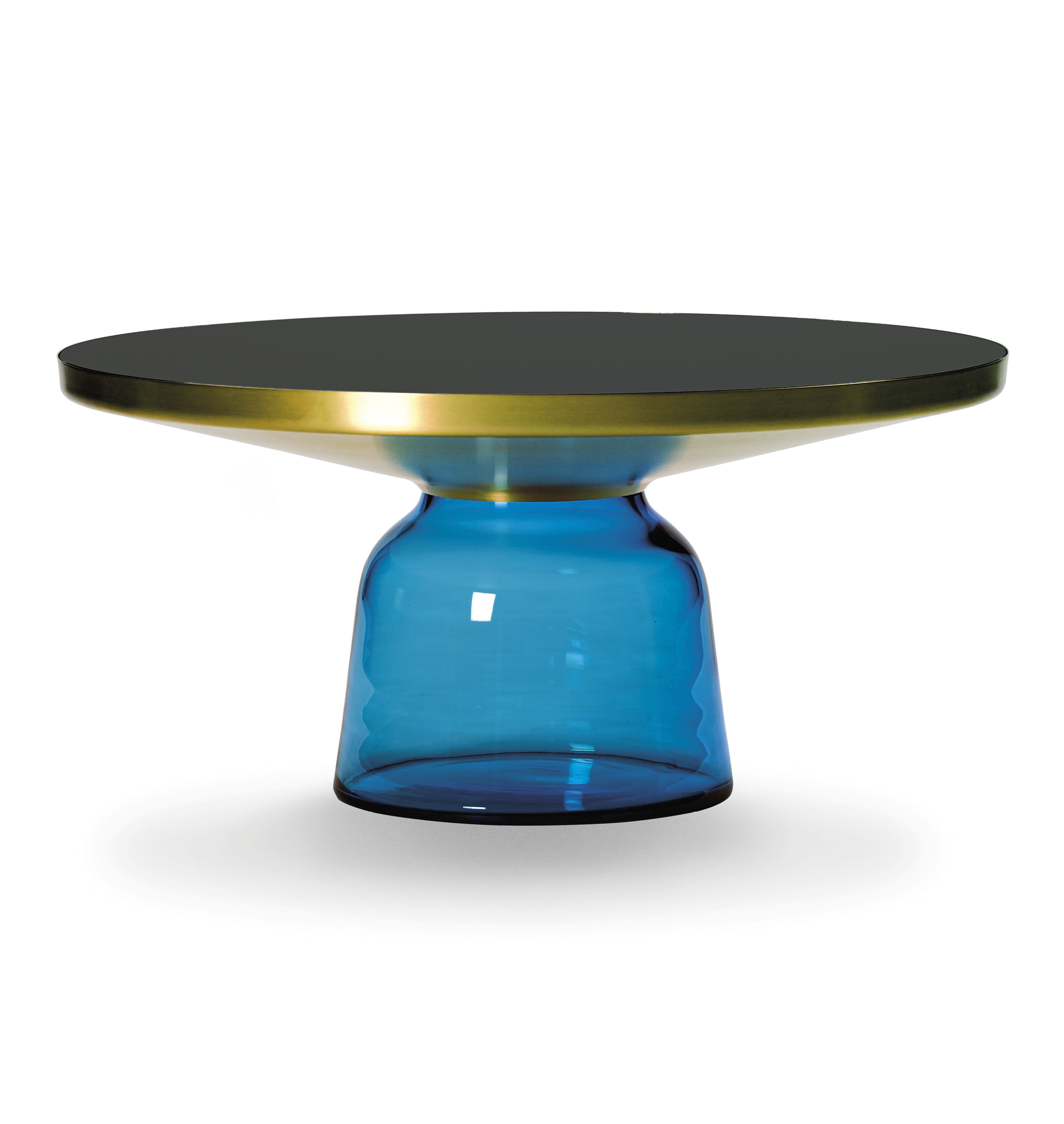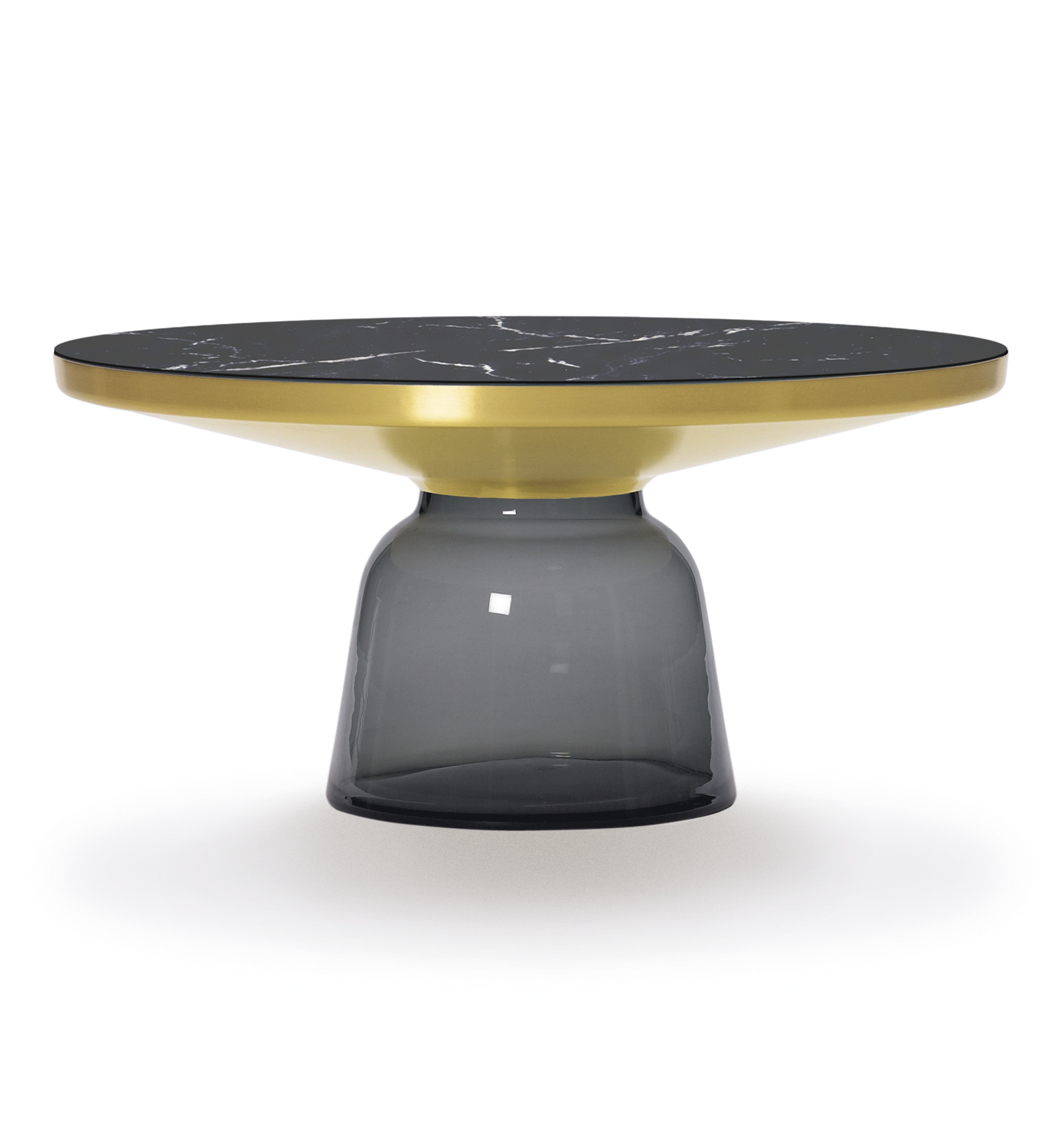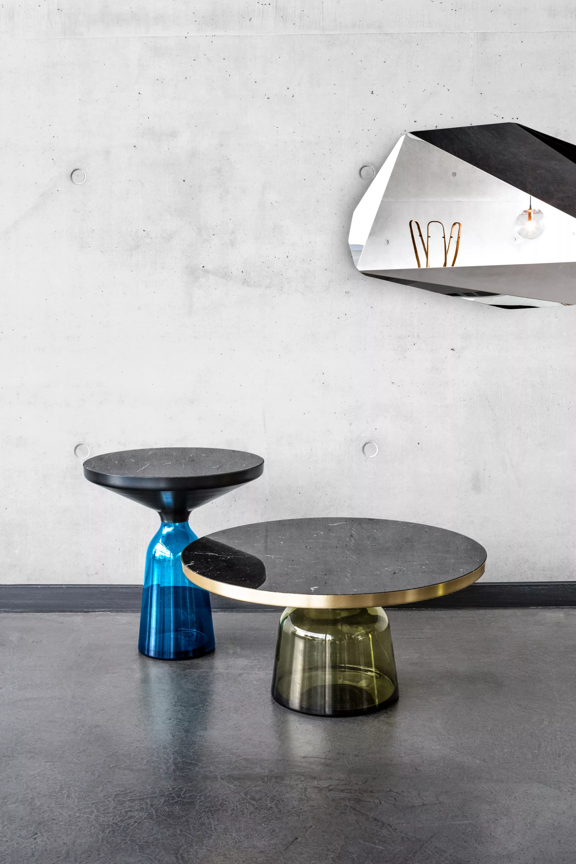 The Bell Table by Sebastian Herkner turns our perceptual habits on their head, using the lightweight, fragile material of glass as a base for a metal top that seems to float above it. Hand-blown in the traditional manner using a wooden mould, the transparent tinted glass base asserts a sculptural presence in space, intriguingly contrasting with the solid brass frame on top while also forming a harmonious unit with it, recalling the elegant curved silhouette of a bell.