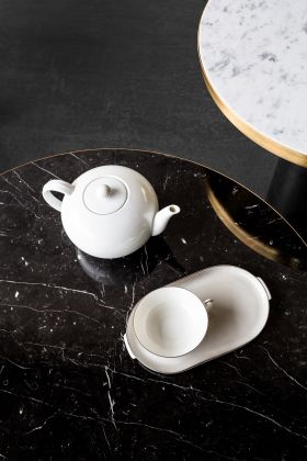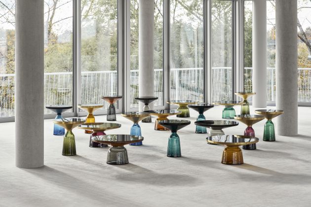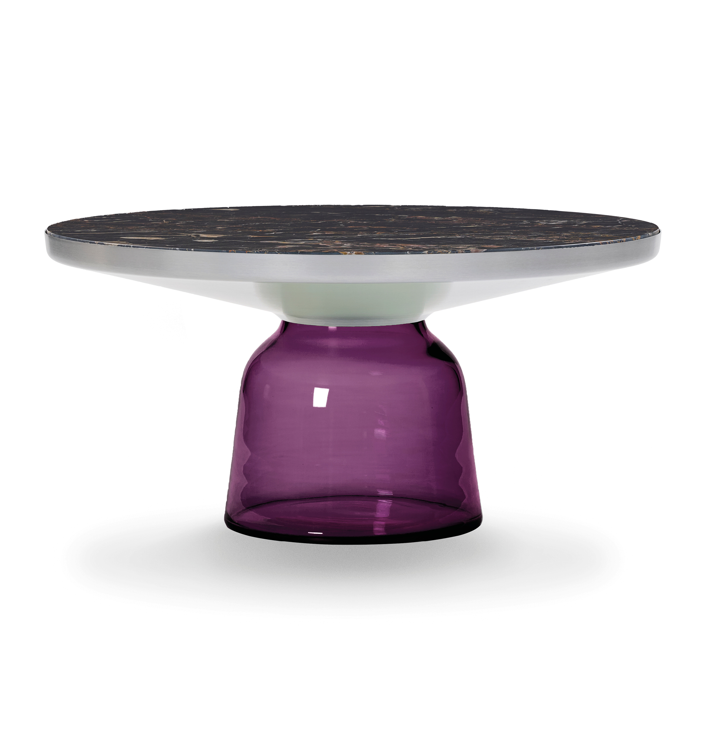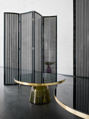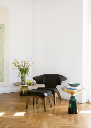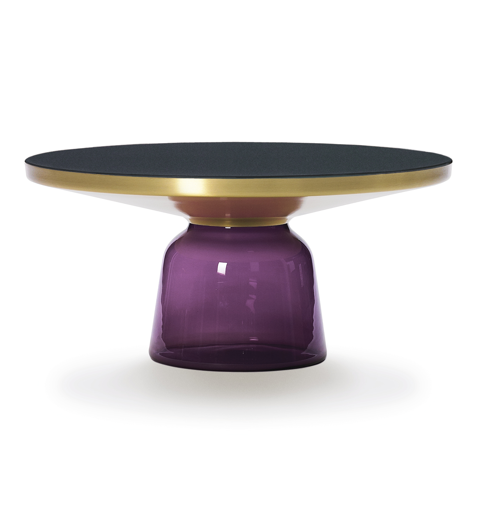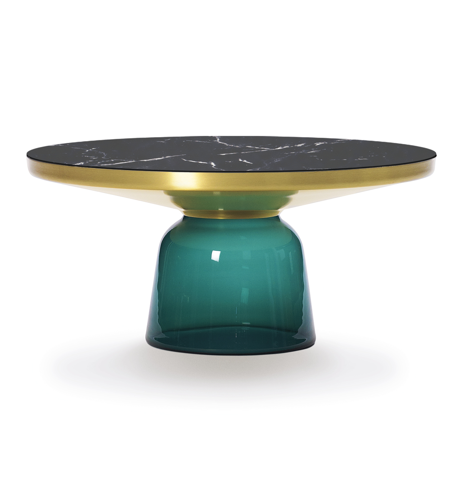 The Bell Table by Sebastian Herkner turns our perceptual habits on their head, using the lightweight, fragile material of glass as a base for a metal top that seems to float above it. Hand-blown in the traditional manner using a wooden mould, the transparent tinted glass base asserts a sculptural presence in space, intriguingly contrasting with the solid brass frame on top while also forming a harmonious unit with it, recalling the elegant curved silhouette of a bell.