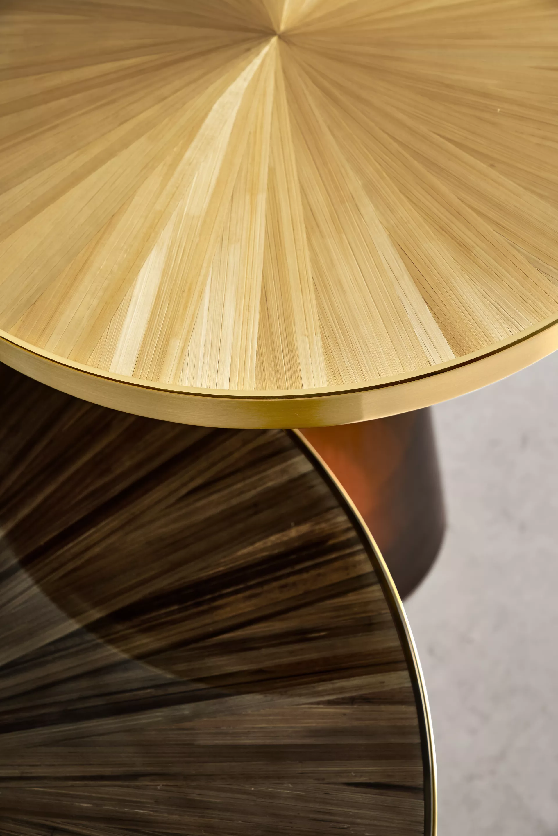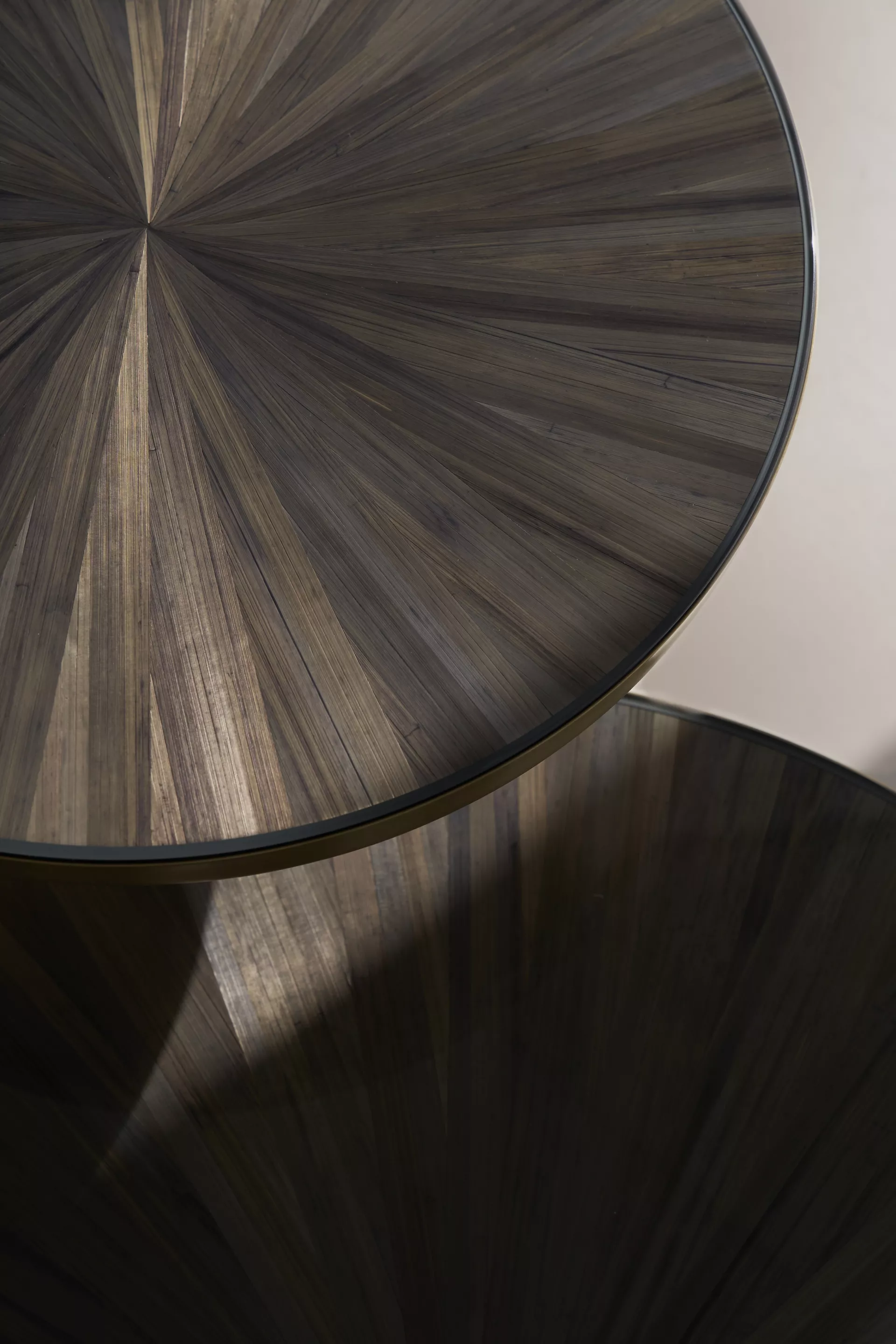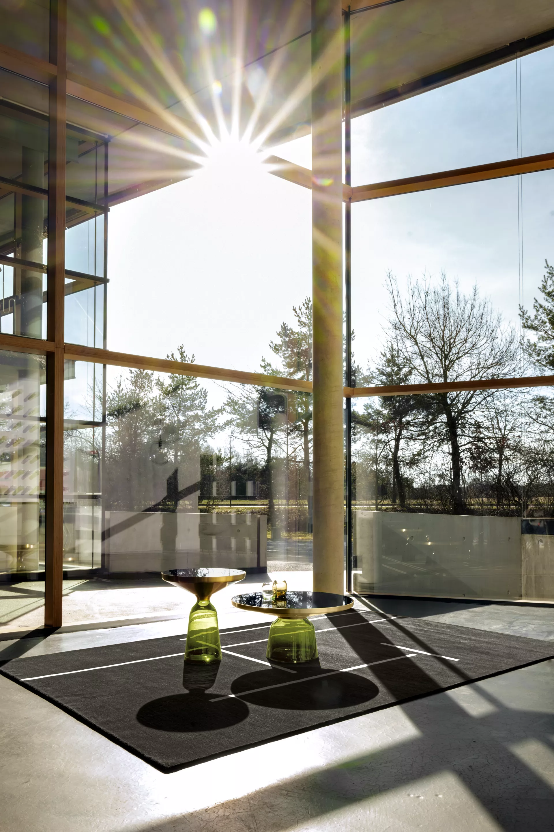 With its appealing reflective surfaces and contrasting materials, the side table adds a distinctive touch to living environments. It celebrates the beauty of the materials with their colours and surfaces, along with the workmanship. The Bell Table is a masterwork of traditional craftsmanship. Each table is handmade and has characteristic features such as irregularities in glass thickness, small bubbles or bumps in the glass. In 2024, premium craftsmanship has been taken to a new level and the Bell Side Tables and Bell Coffee Tables are complemented by a version with straw marquetry worked into the tabletop. Using precision craftsmanship, the individual straw strips are applied to a base panel, spreading outwards from the centre across the surface like rays of sunlight.