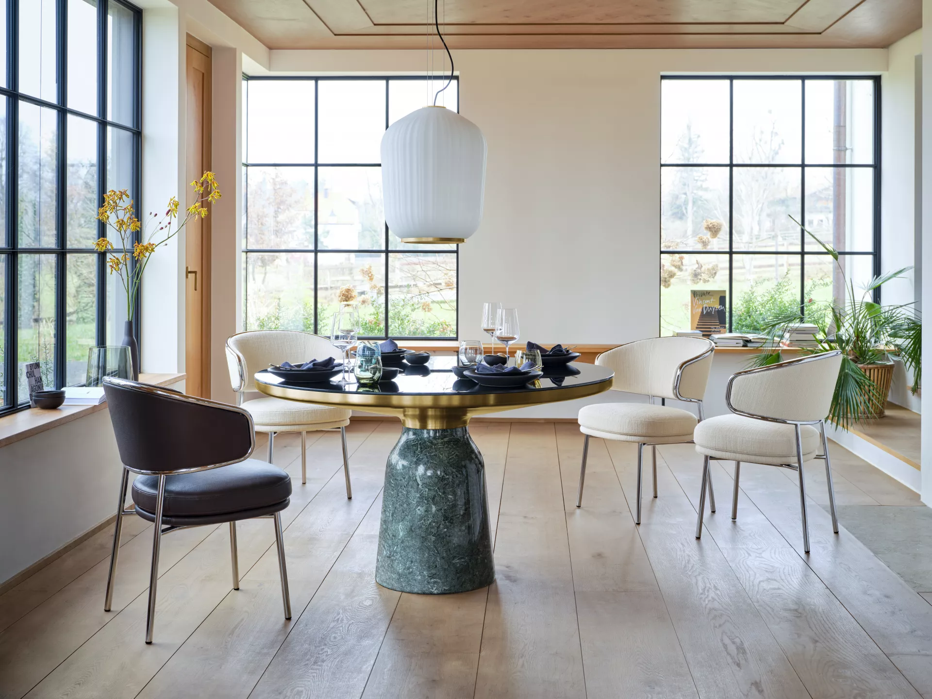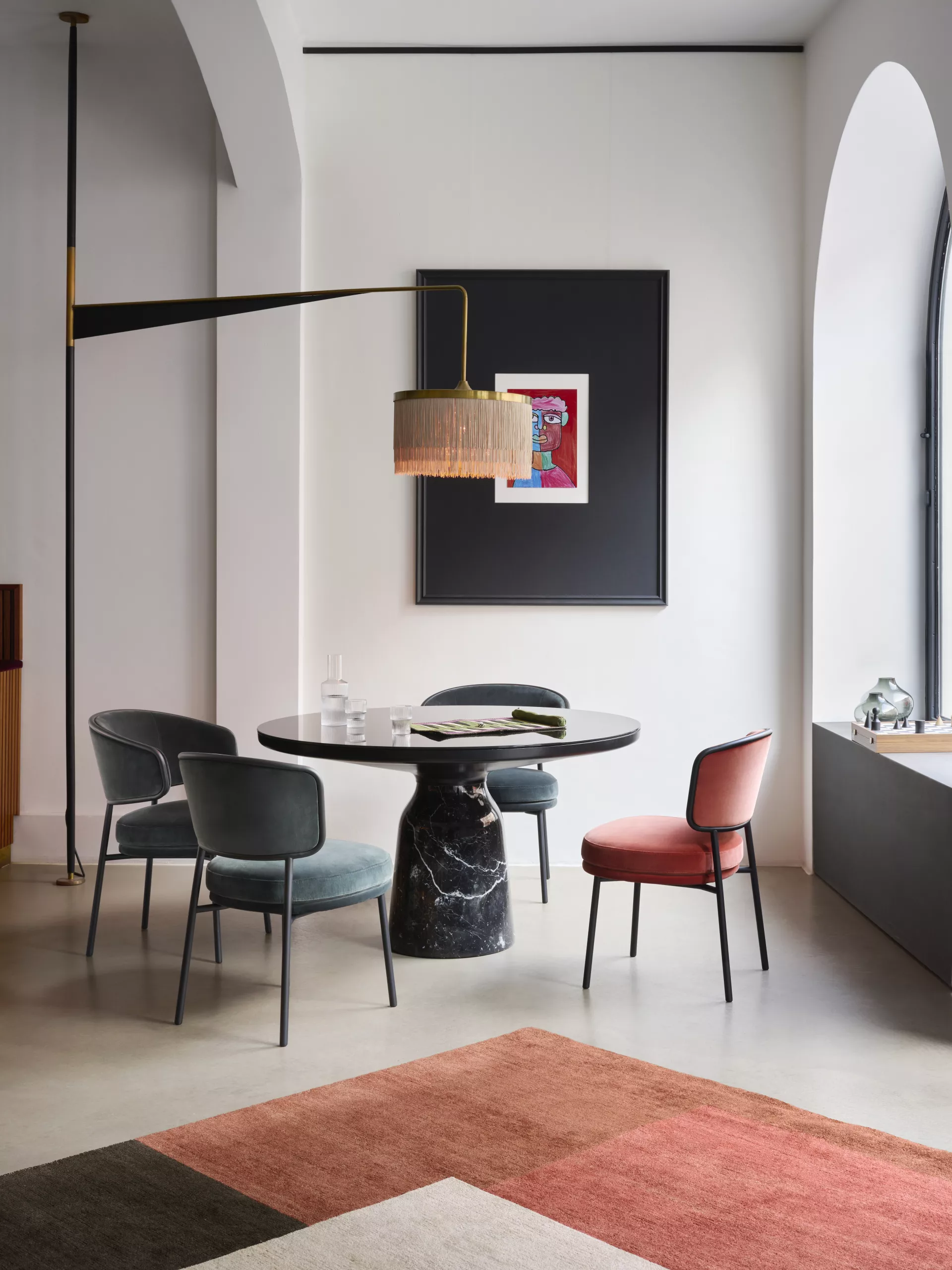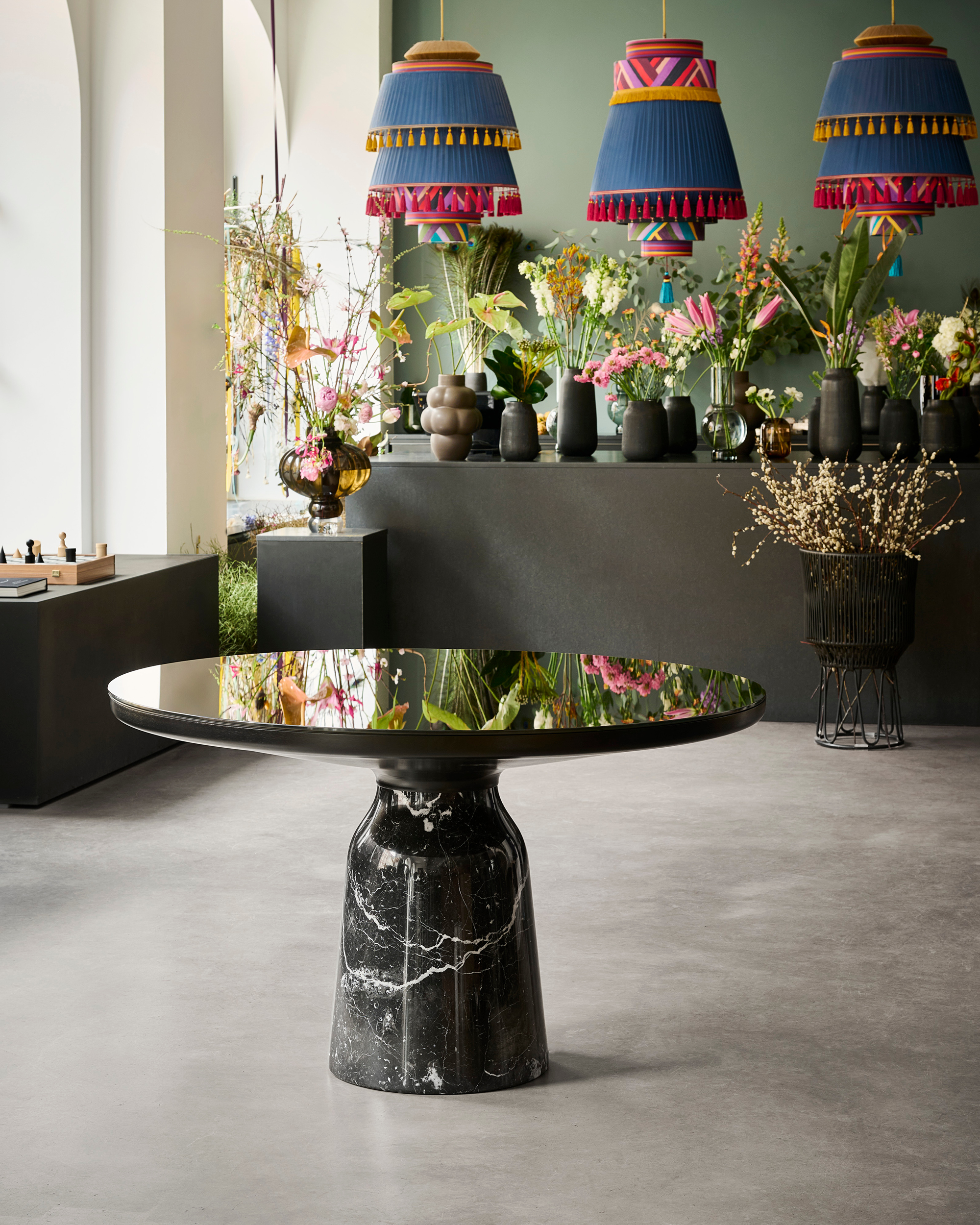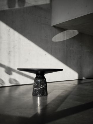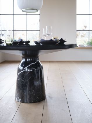 The Bell Dining Table transfers the elegance of the Bell Tables into new dimensions. For the dining table version, the striking glass base has been replaced by a different material: marble. Since its launch in 2012, this design by Sebastian Herkner with its unconventional use of materials has been regarded as a modern classic. In this new dimension, it continues to impress with its shape, which is reminiscent of the slight curve of a bell. The elegance of the original design is retained by the hand-polished, shiny marble. At the same time, the new material lends the table a grounded look that conveys stability and durability. The contrasting vein of the two types of marble adds a new interplay of colours to the palette of the Bell Dining Table.