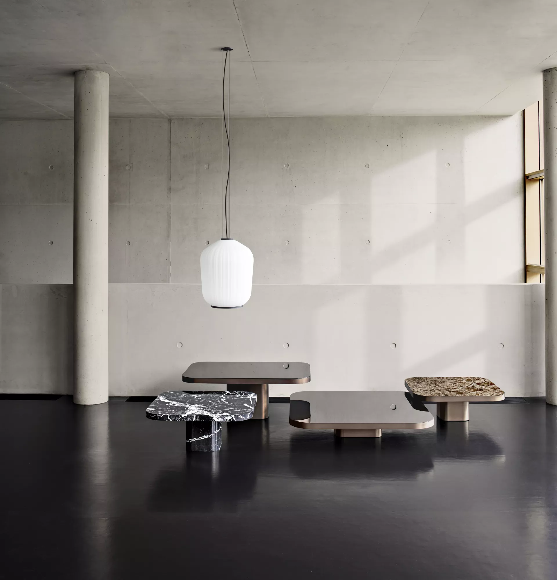 The ensemble is complemented by the Bow Coffee Table No. 3 Marble, completely made of white or black marble. Combined with the other sizes in brass, it establishes an interesting contrast of materials.