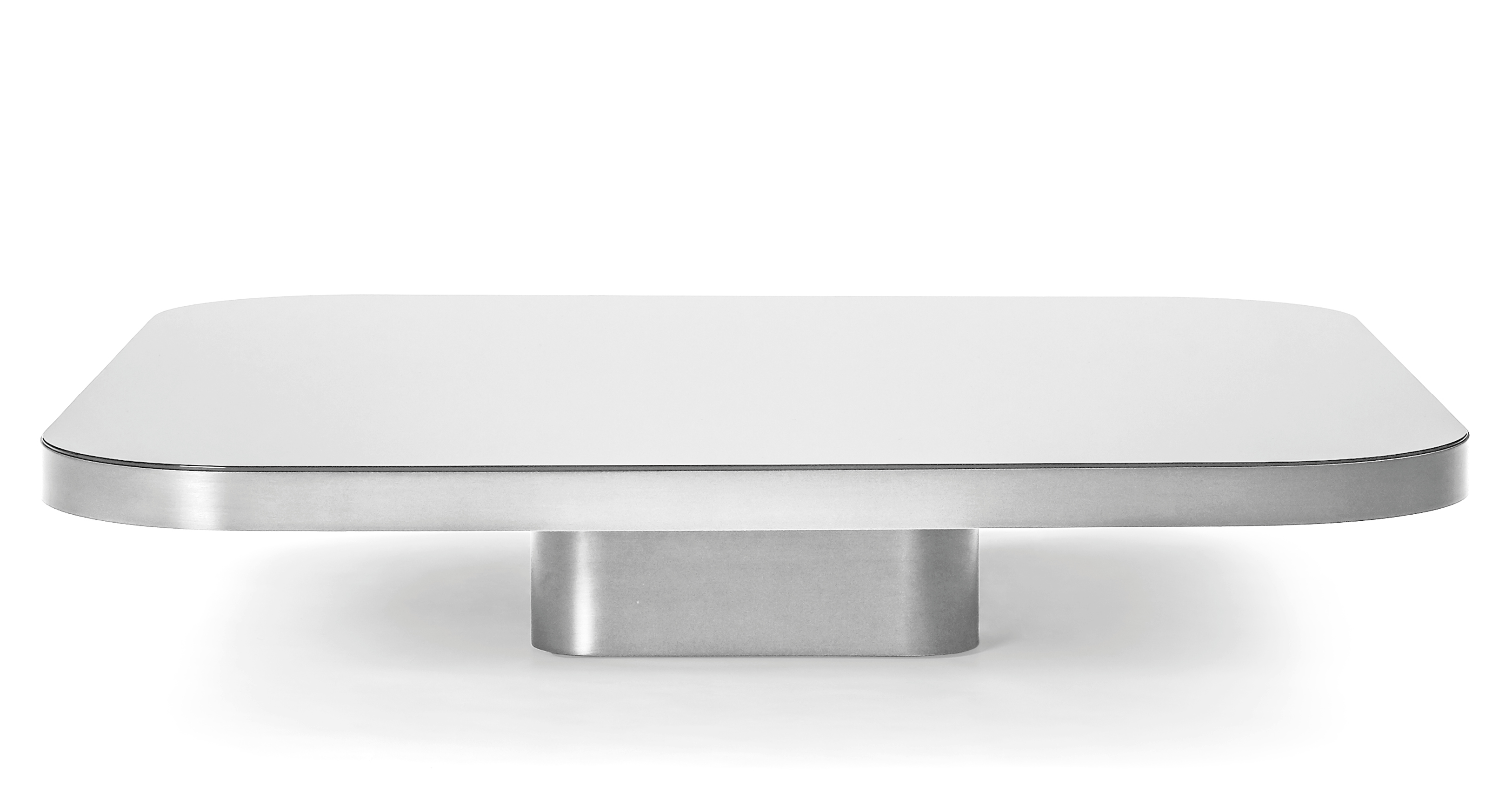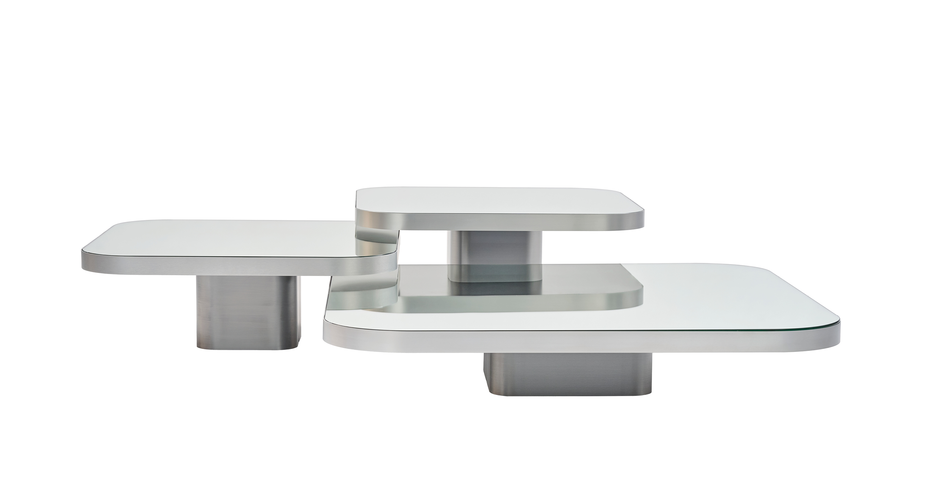 Inspired by 1970s lines and designs, Brazilian Guilherme Torres presents a side table or coffee table of casual elegance. The metal-covered surface of the body also quotes futuristic designs of the era, but it is a clearly contemporary design. The glass or marble covered tabletop floats above a base with rounded edges. The table is available in five sizes. Combined in different heights, the tables can be arranged as a group with overlapping tabletops, resulting in a dynamic sculpture with a generous and multi-level storage surface.