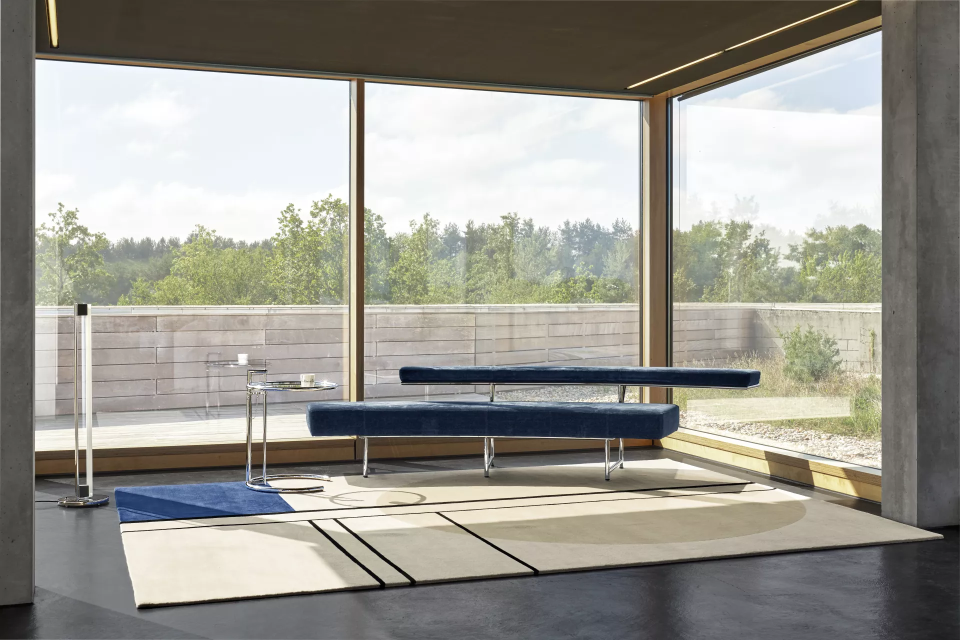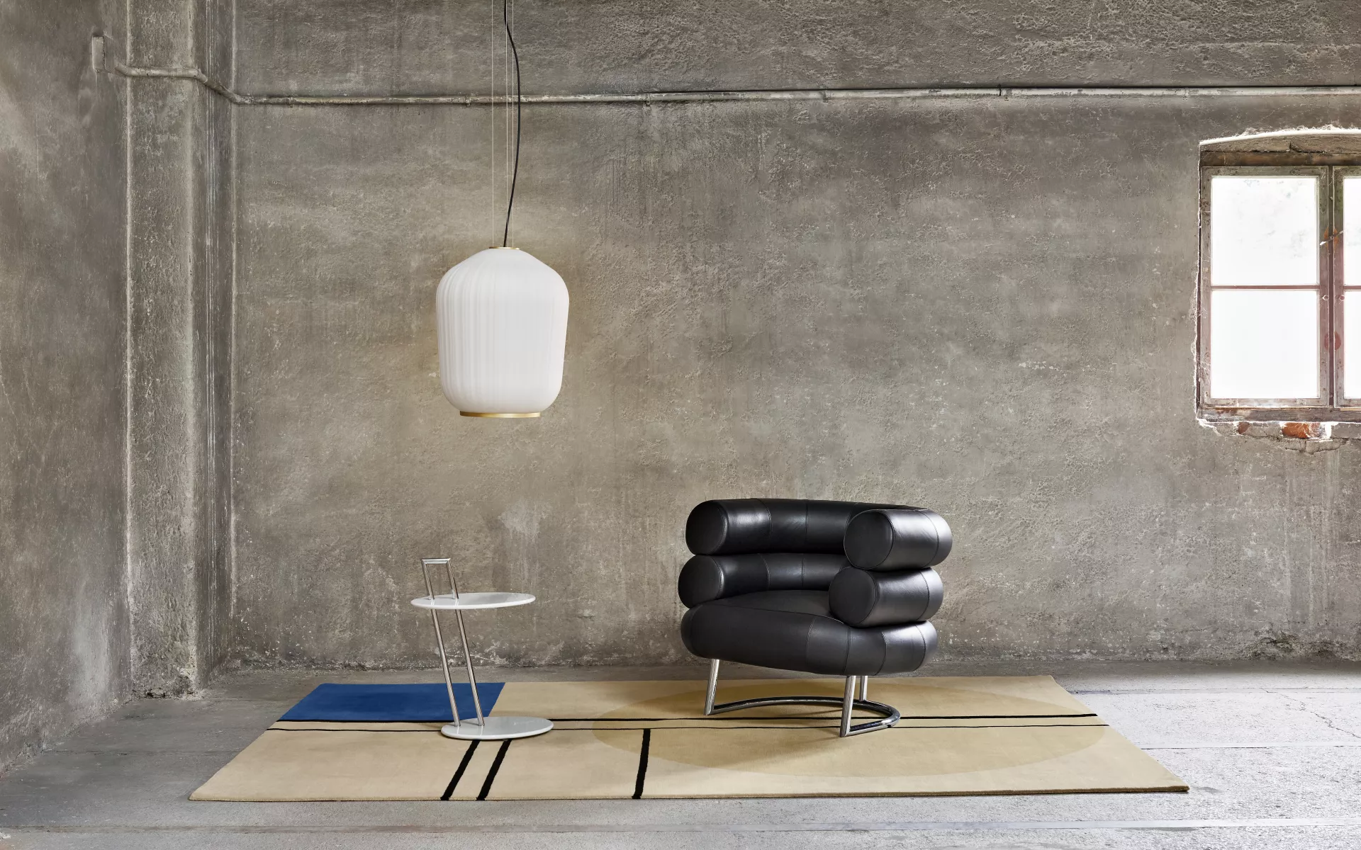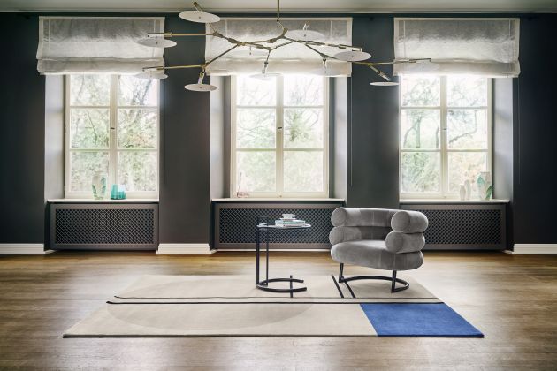 Eileen Gray not only created some of the most iconic 20th century furniture classics but also ran a studio where rugs were produced based on her designs. Some of her most beautiful designs are part of the rug collection by ClassiCon. De Stijl is based on Eileen Gray’s gouaches and pencil drawings from the 1920s. Its geometric design is based on a grid of black lines, a navy blue rectangle and a beige circle motif.