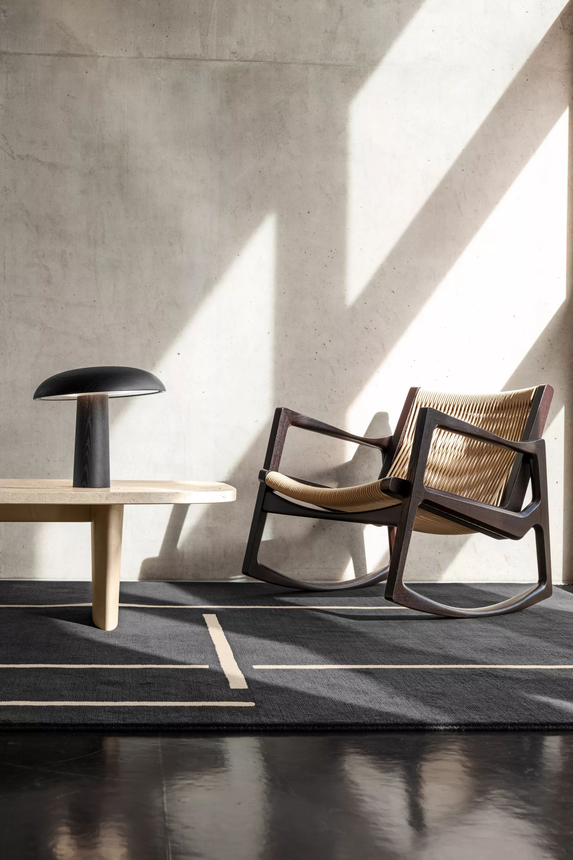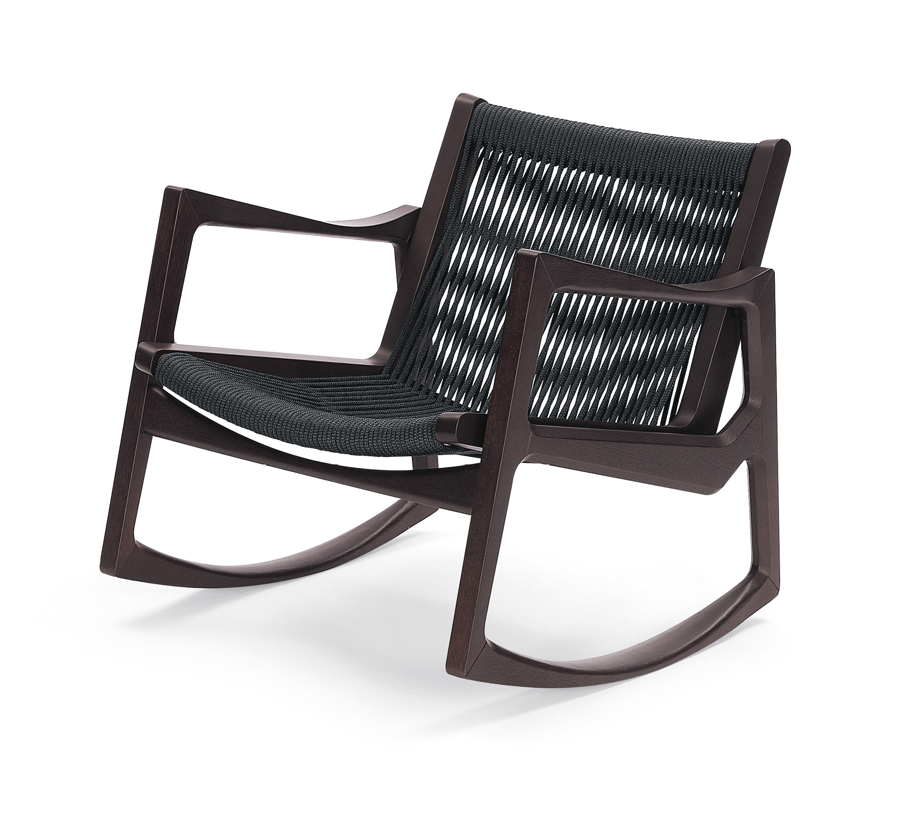 The Euvira rocking chair by Jader Almeida is a masterful blend of yesterday and today, lightness and solidity. With its precisely orchestrated flowing lines, thickening and tapering to form a pleasing rhythm, the chair is a signature expression of contemporary design. At the same time, the choice of materials and their treatment recalls the work of the great Brazilian design masters of the 1960s and 70s. The cord seat and backrest lend the chair a special lightness and transparency, unfolding a fascinating graphic play of lines, especially when in motion. With fabric or leather upholstery, it takes on the feel of an elegant club chair.