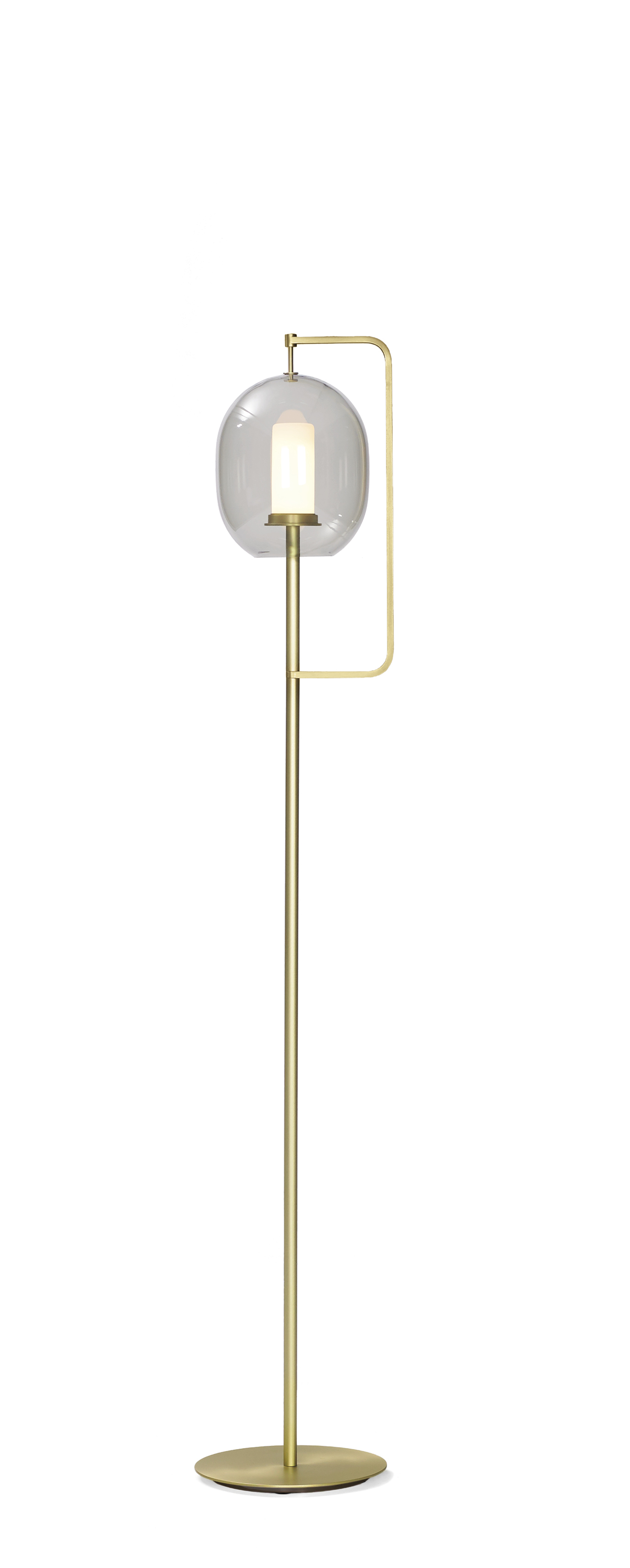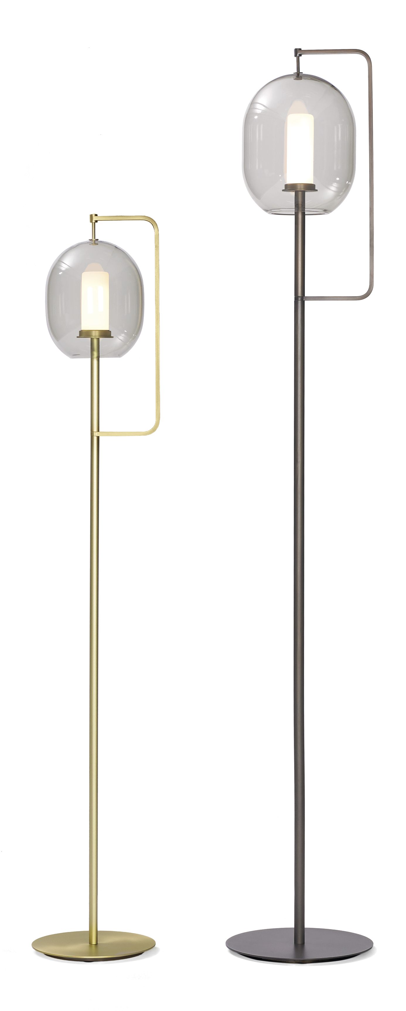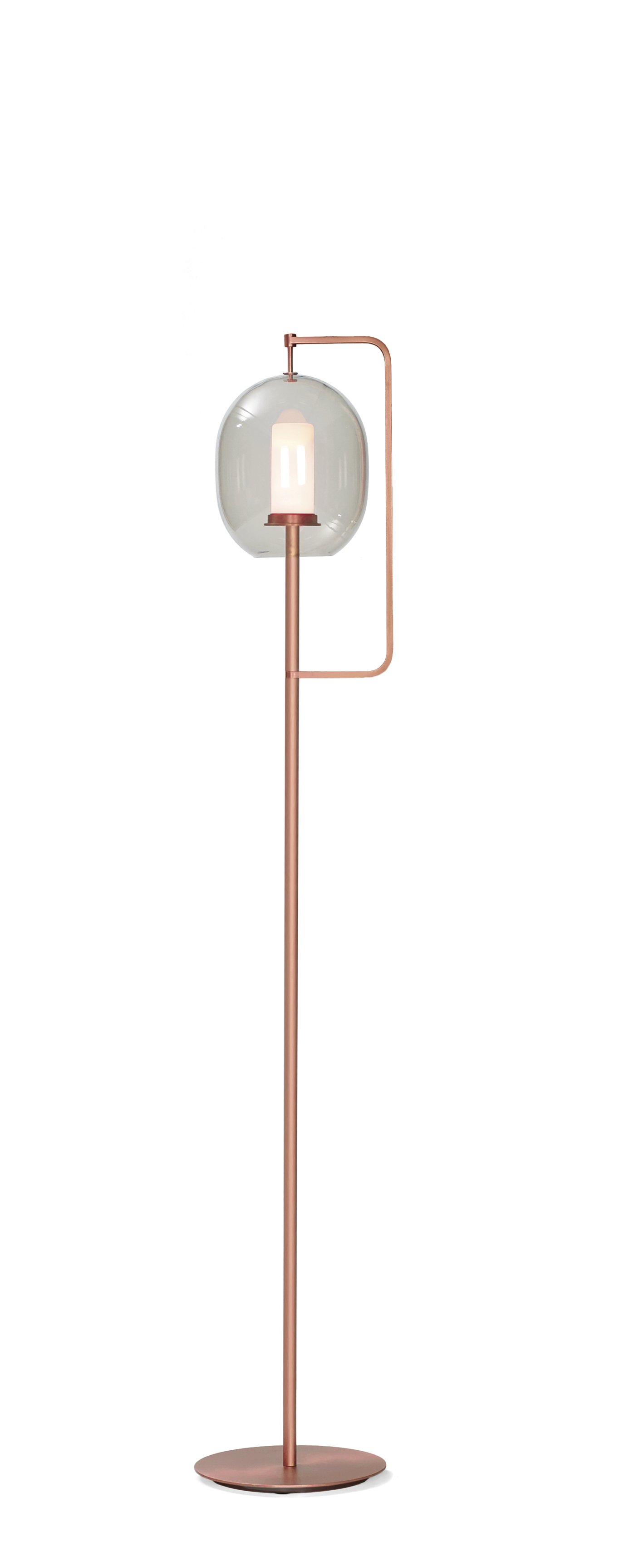 In our everyday existence, light serves us by enhancing everything around it, while it is often neglected itself. Here, the inspiration comes from the quintessential source of light; like its ancient predecessor, the fiery torch, this design simply consists of an upright rod with an illuminated tip. Celebrating the glorious spectacle of light itself, the tinted glass shade is a modest attachment that branches off the main support to gently shield its centerpiece.