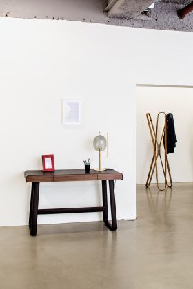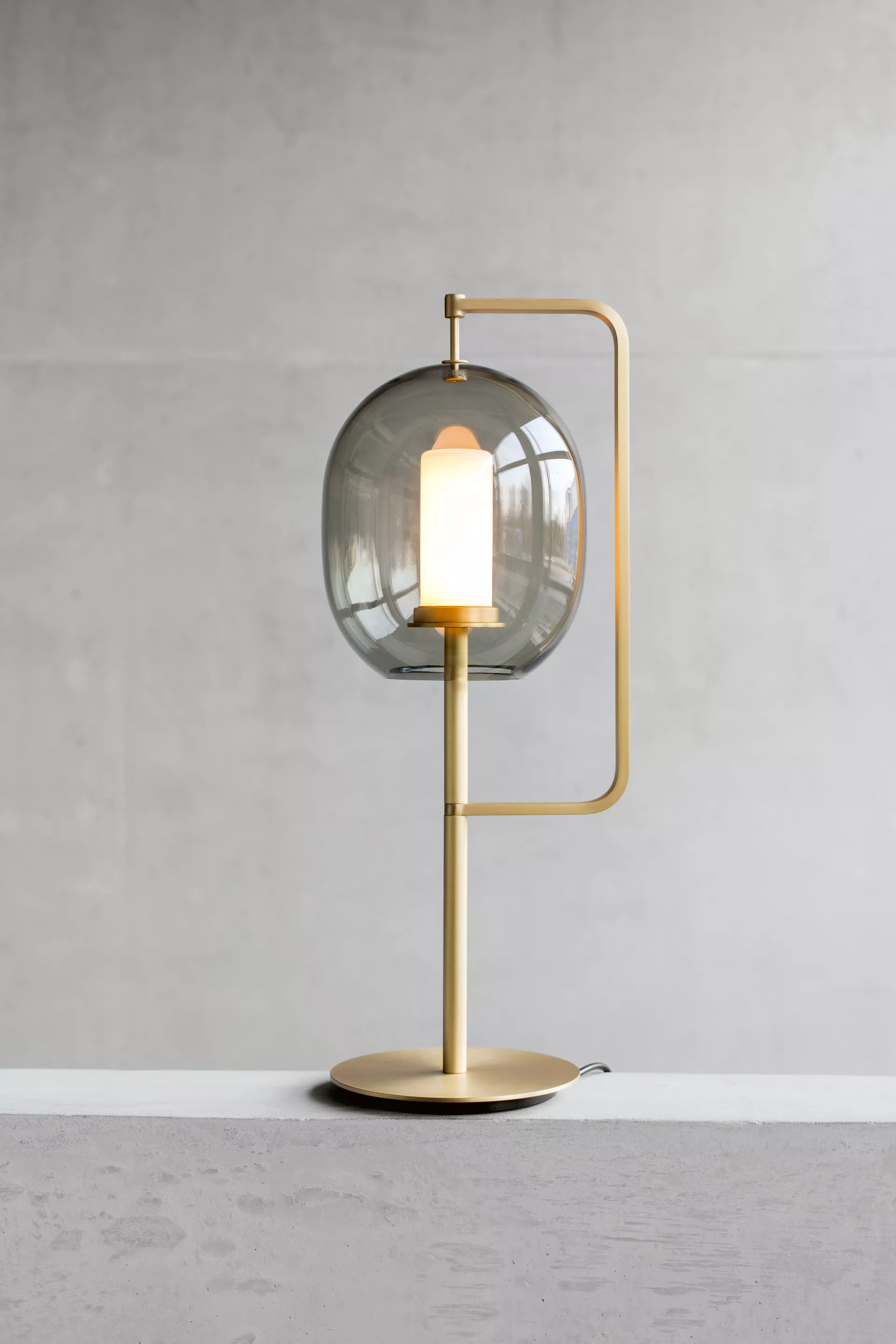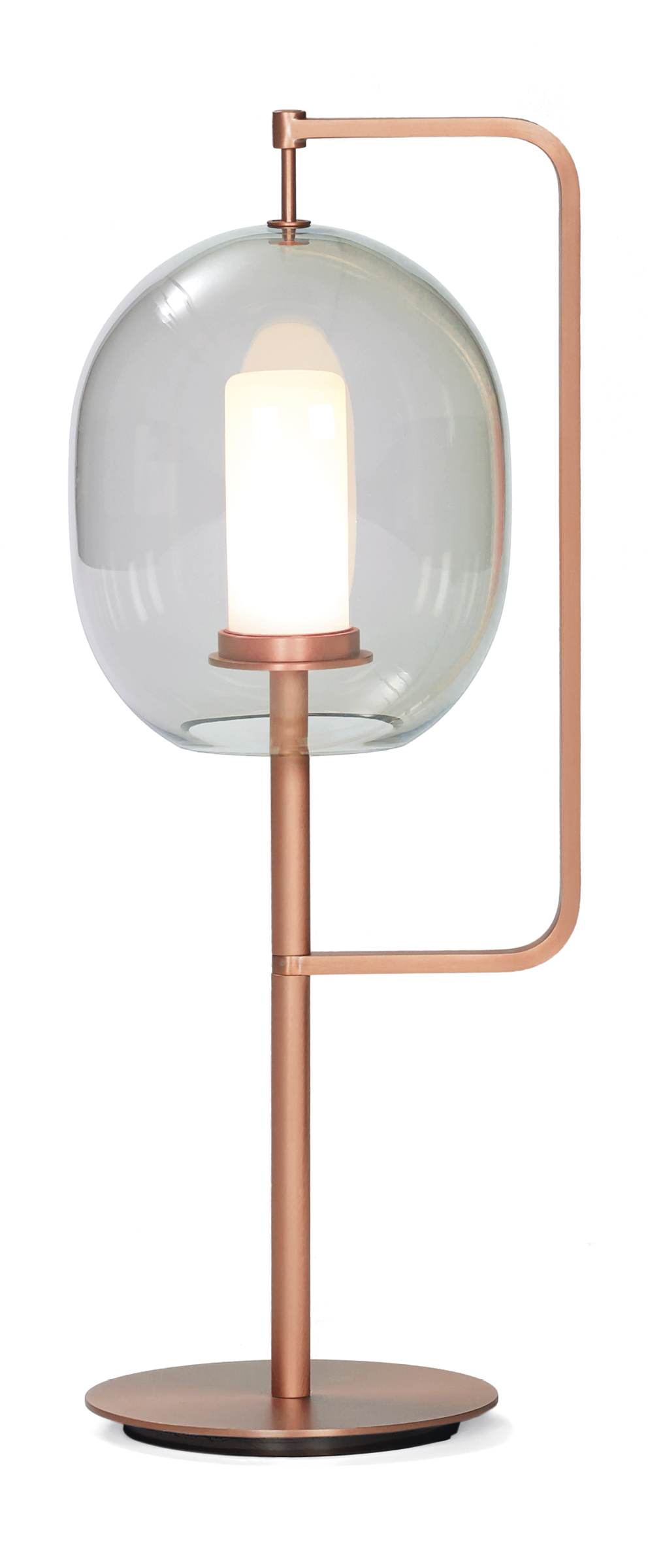 In our everyday existence, light serves us by enhancing everything around it, while it is often neglected itself. Here, the inspiration comes from the quintessential source of light; like its ancient predecessor, the fiery torch, this design simply consists of an upright rod with an illuminated tip. Celebrating the glorious spectacle of light itself, the tinted glass shade is a modest attachment that branches off the main support to gently shield its centerpiece.