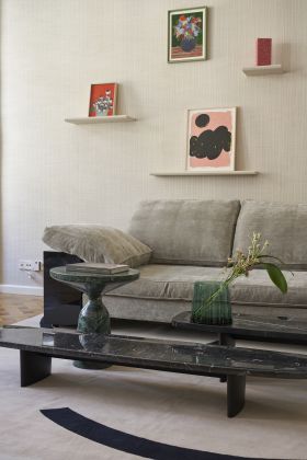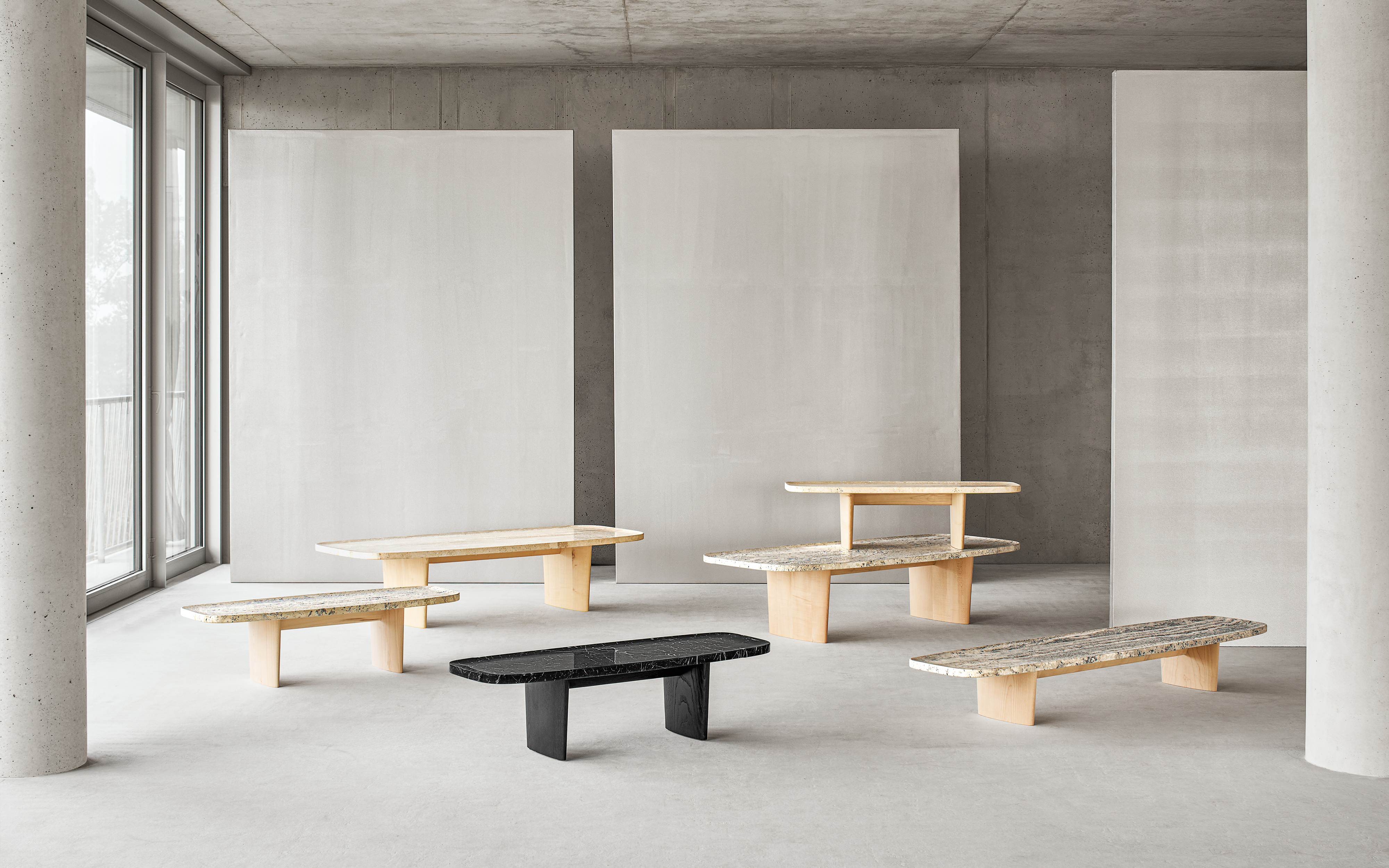 The Matéria low board / occasional table series is characterised by its special dimensions and calm aura. The concave, organically shaped tabletop evokes an intuitive desire to stroke its surface and feel its natural texture. What was originally a purely experimental design by German designer Christian Haas has been developed into a trio in collaboration with ClassiCon. Matéria is available in three different sizes and in three different finishes. Individually or in combination, these handcrafted low boards are characterised by their materiality and demonstrate how sensuous a minimalist approach can be. In addition to the versions made of natural or indigo-stained, open-pored travertine in combination with light ash wood, the series is also available in a deep black version with a tabletop made of high-quality Nero Marquina marble and a frame made of black lacquered ash wood. The black marble version has the presence and constancy of a sculpture and exudes a luxurious flair. The natural marbling of the high-sheen, impregnated natural stone makes each piece unique. Both versions of Matéria – travertine or marble – are captivating in their own unique way with their incomparable, natural look, which is reminiscent of an abstract painting.