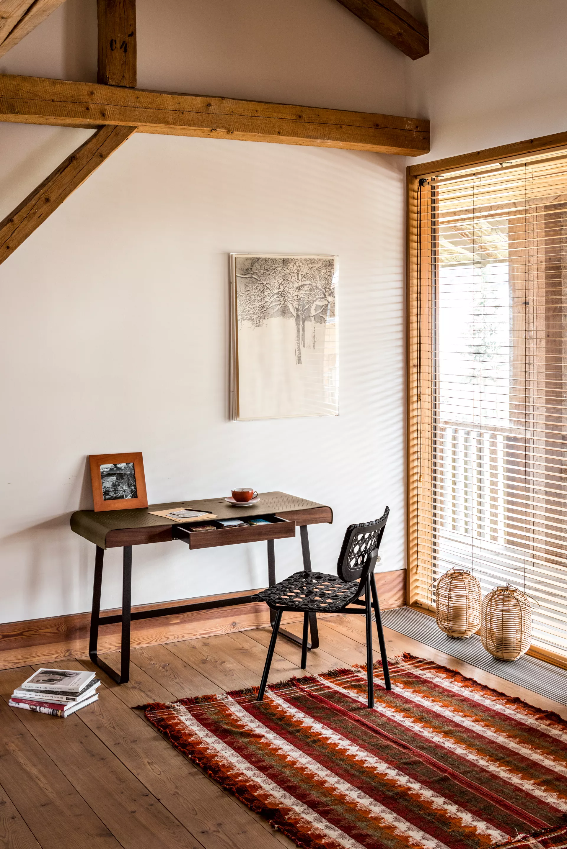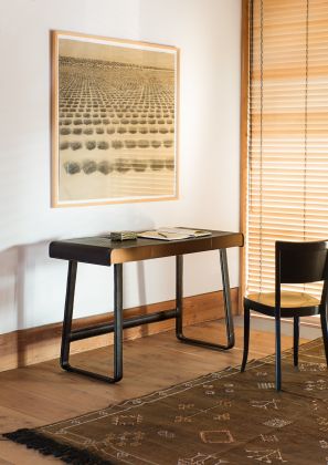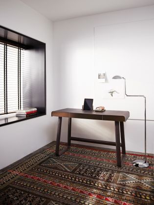 The Pegasus Home Desk is a small, ingeniously conceived home workplace that provides space for the digital devices that have long since become part of our everyday lives. A well-designed workplace solution is conjoined here with the elegance of a perfectly crafted piece of domestic furniture. The thick bend-leather tabletop can be rolled or folded upward as needed to access the intelligently arranged compartments below. Here there is space for a laptop, tablet PC, mobile phone, paper, charging stations, power supply or other accessories.