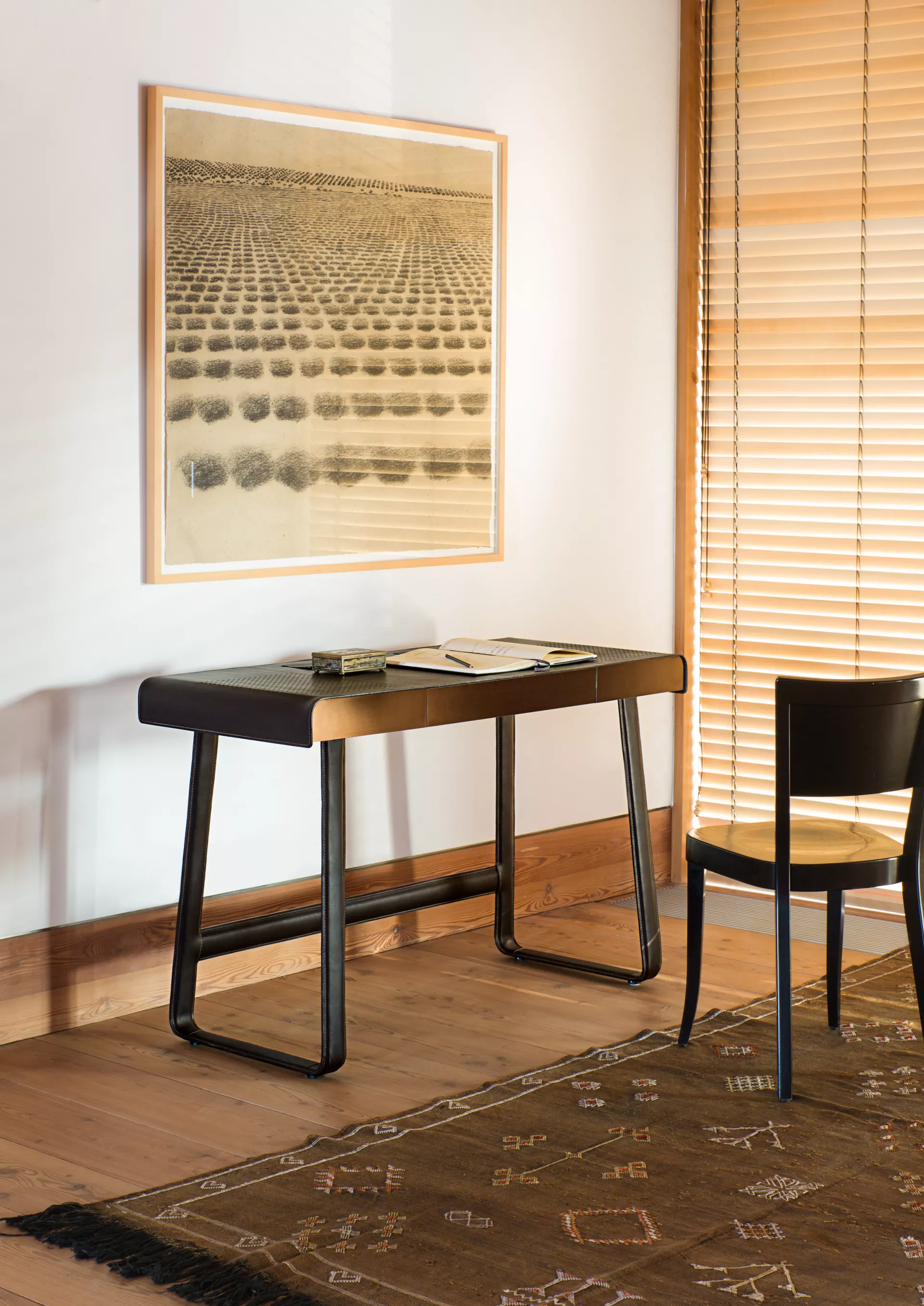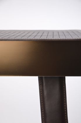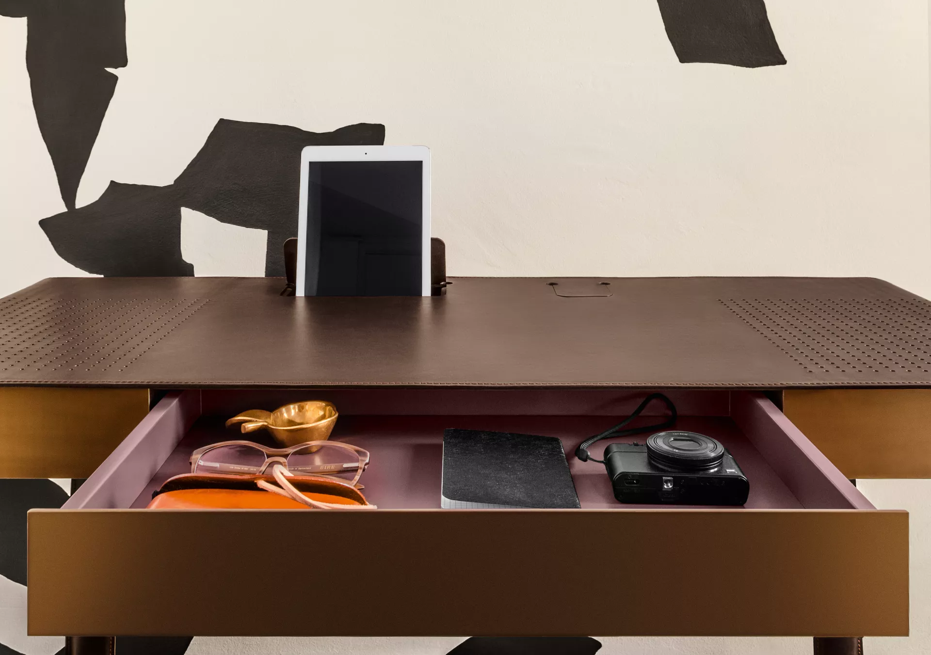 The finely perforated pattern of the leather not only creates a visually interesting surface structure but also hints at the devices stowed below while providing additional ventilation of the relevant compartments. Like in a saddle bag, these objects disappear inside and yet are readily available at any time. The Pegasus Home Desk brings order to the chaos of digital everyday life, juxtaposing high-tech aesthetics with the material qualities, feel and workmanship of the artisanal world of the leatherworker and saddle-maker.