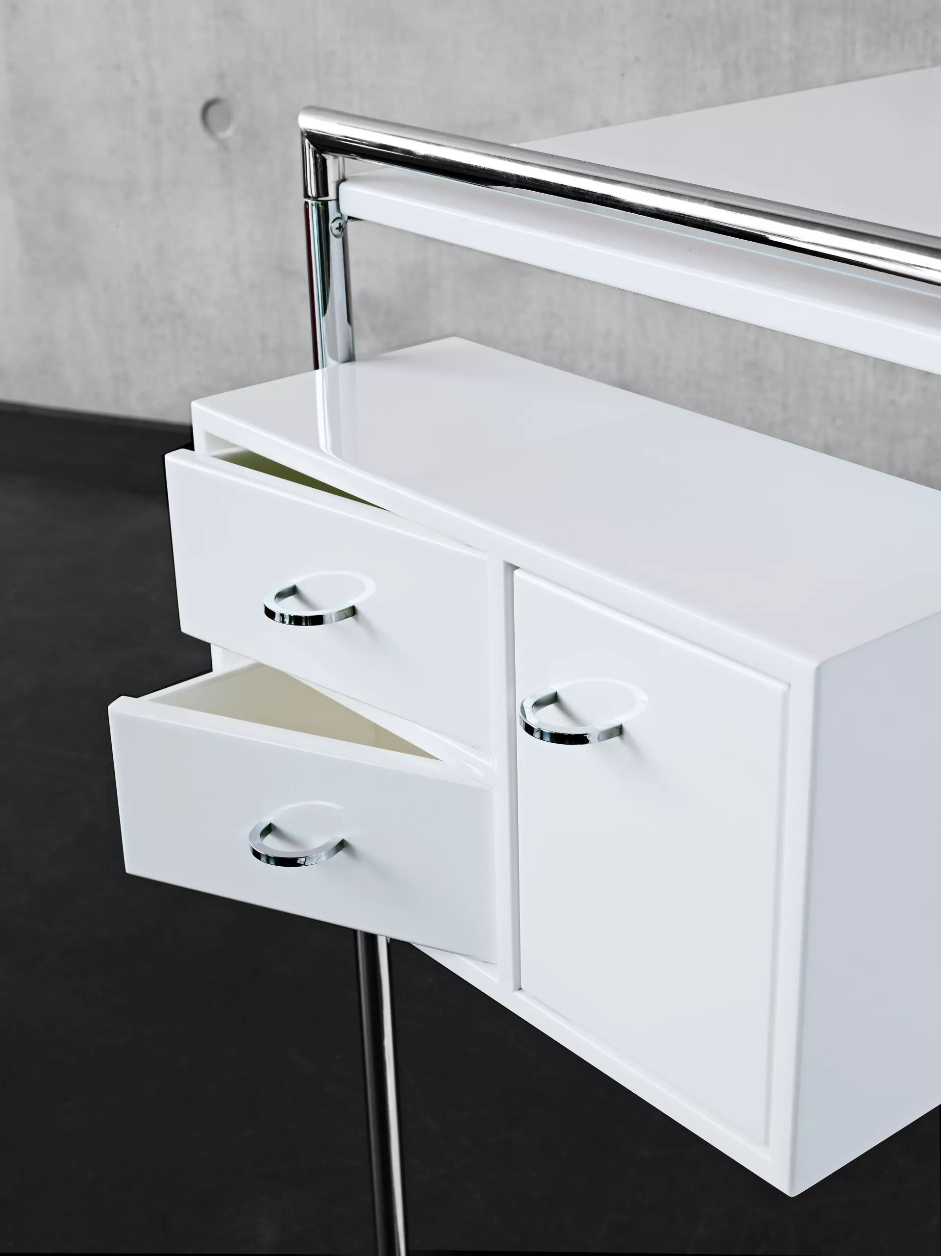 of this. The drawers in the small side box of the Petite Coiffeuse swivel out. Everything is reduced to the essentials, but it is all within easy reach.
