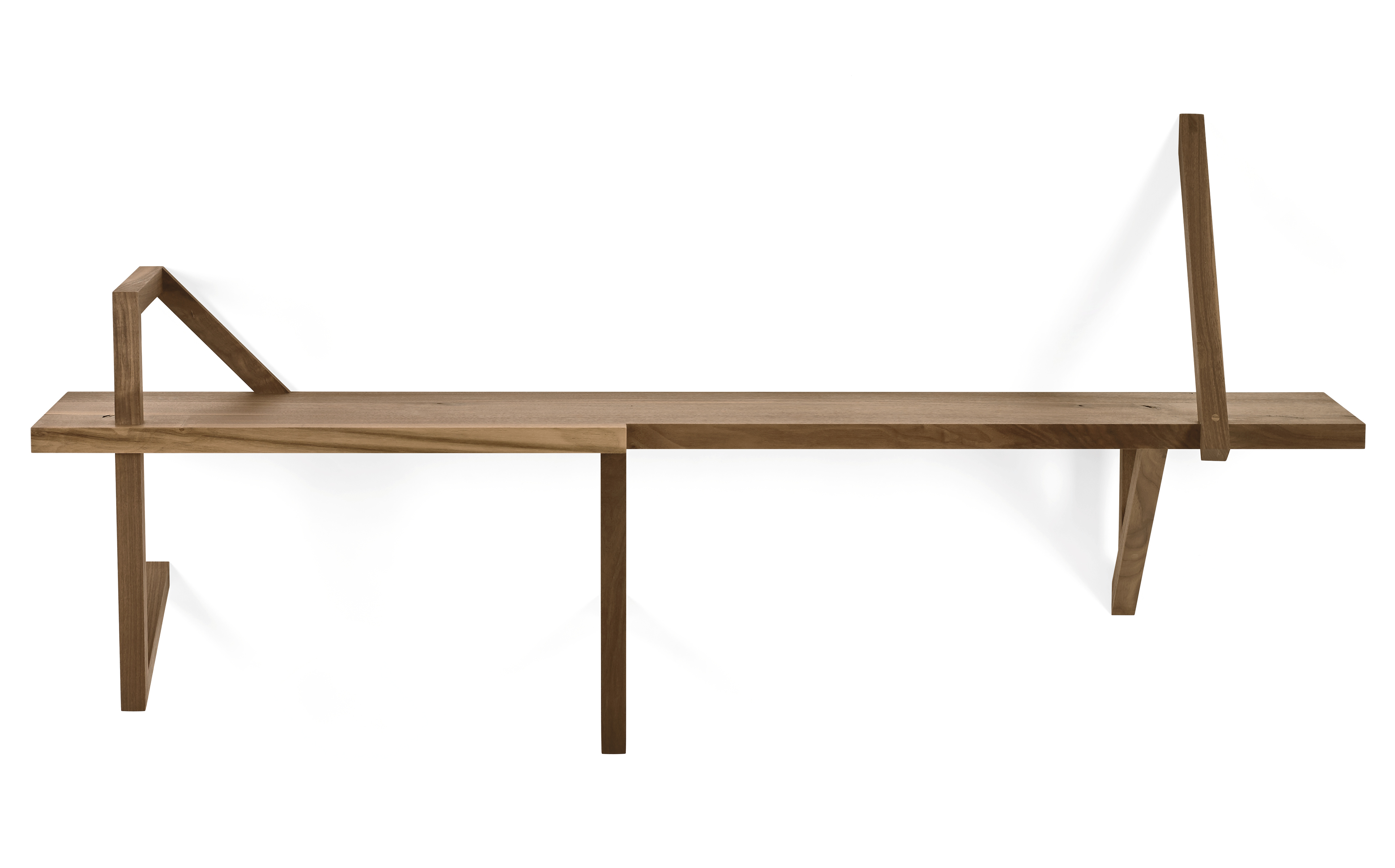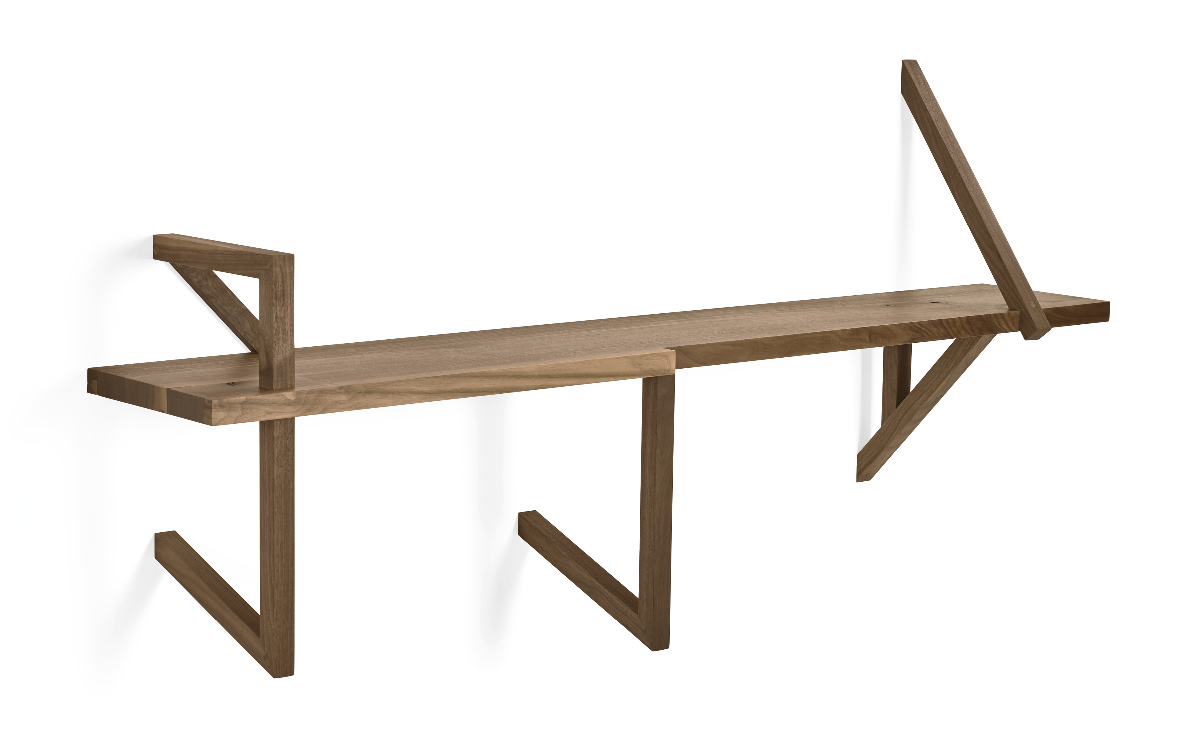 Sculpture or shelf, storage surface or object – the various models of the Taidgh series created by the Californian designer Taidgh O’Neill move within these poles. Surfaces provide room for storage and the presentation of beautiful things; carefully selected solid wood provides a strong and vibrant surface due to its natural grain. The special charm of the objects results from the fragmented construction of different elements that are connected in unusually sophisticated ways. Like symbols or emblems, they design the surface on which they are mounted.